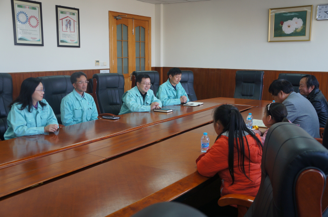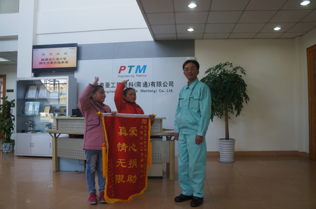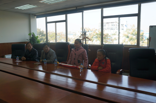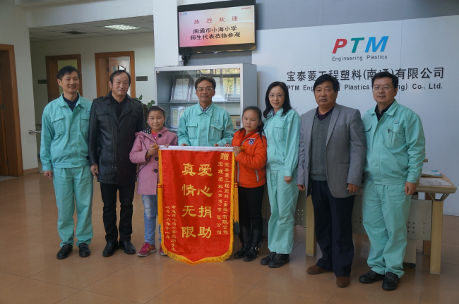 11月11日下午,在小海小学施叶兵校长和陆永明主任带领下,受宝泰菱、宝理两家公司捐助的学生代表孙笑笑、冉燕红来到宝泰菱公司参加了在该公司举行的向贫困学生捐助的仪式。宝泰菱公司总经理荒川、副总经理董祥华、工会主席石小云出席了本次活动。