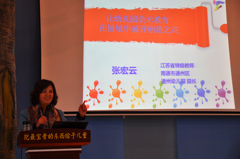 下午,张宏云园长作了《让幼儿园美术教育在情境中盛开创造之花》的专题讲座。她结合教育实践,指出当下幼儿园美术教育中存在的问题,通过《跟着线走》、《小小发型师》等典型案例的分析解读了美术教育、情境、创造力三者的融合,让大家明白了儿童是天生的艺术家,我们要怀有儿童敬畏心,给孩子温暖的期待,激发其创造欲望。