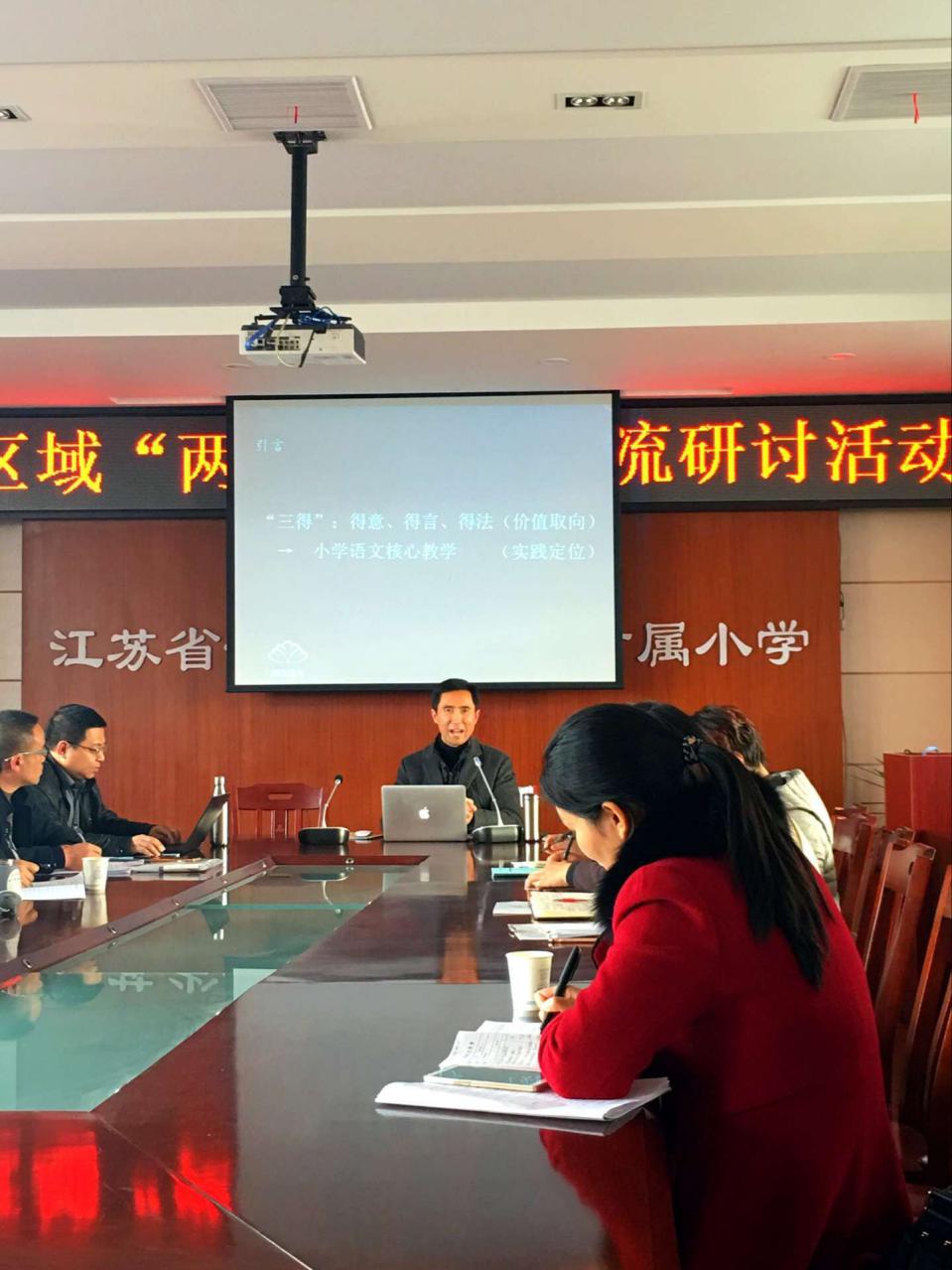 南通市教育科学研究院邢晔主任和大家阐述了“两课融合”教研的意义,展望了其教研的美好前景。江苏省特级教师,海门实验学校附属小学校长沈荣向大家进行了《“‘三得’取向,核心教育”》的汇报,带领与会老师感受了教育科研的新生态。
