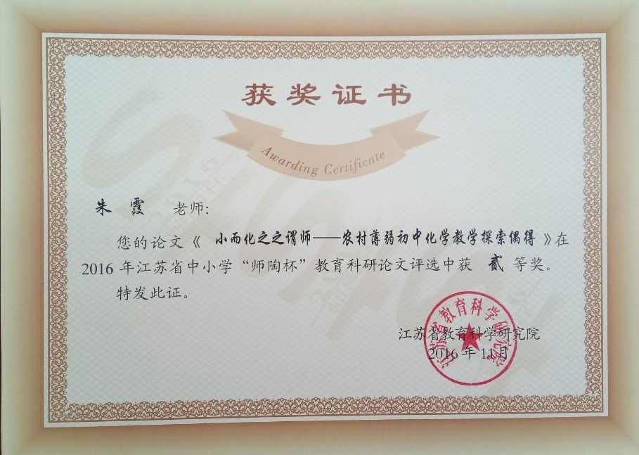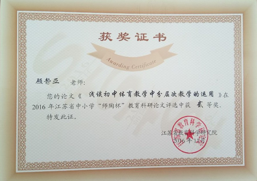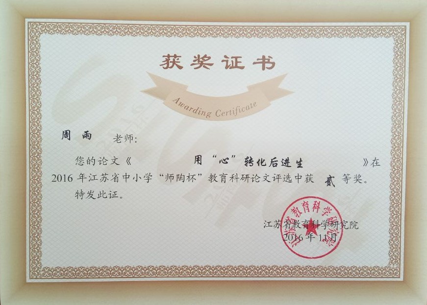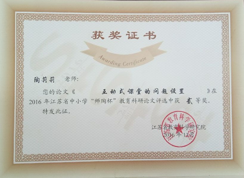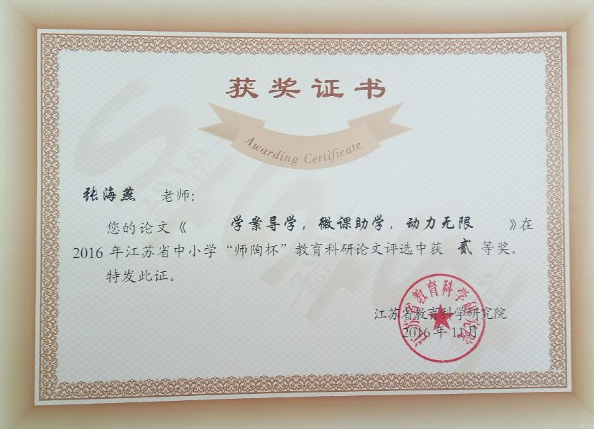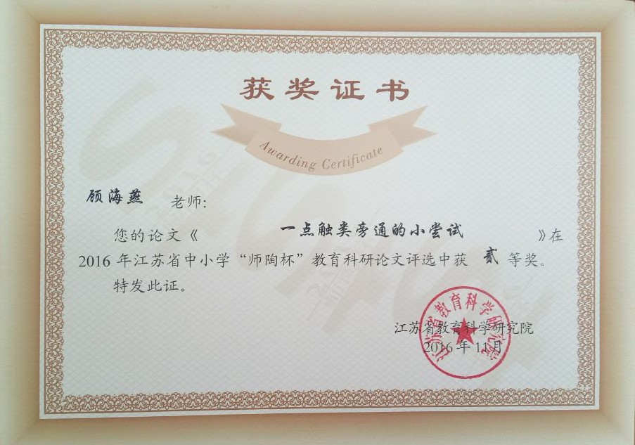 祝贺我校顾海燕老师、朱霞老师、张海燕老师、周雨老师、顾静亚老师、陶莉莉老师在2016年江苏省中小学“师陶杯”教育科研论文评选中获二等奖。