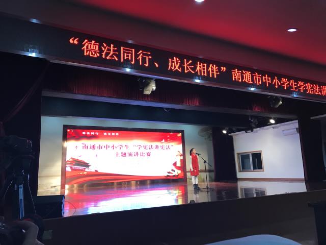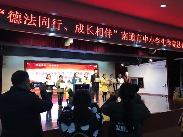2016年12月21日,南通市教育局在如东县宾山小学举行了“南通市中小学生学宪法讲宪法演讲比赛”,南通市各县市区推选出来的33名选手分别参加了高中组、初中组和小学组的比赛,选手们的演讲紧扣主题,仪态大方,神情自然,声情并茂。他们用热情洋溢的语言,以“德法同行、成长相伴”为主题,从交通安全意识、环境保护意识、自护意识、权利义务意识、守法用法意识等各方面展开演讲。或生动地叙述现实生活中一个个触目惊心的青少年违法的故事和案例,给人心灵以极大的震撼;或以“法律是我们的保护伞”等生动形象的比喻引人深思。他们表达了自己对法律的独特理解,对大家进行法律方面的宣传和教育,给大家上了生动的一课,比赛精彩纷呈,高潮迭起,全场爆发出一阵又一阵的热烈掌声,让大家知道学法、守法和用法的重要性,达到了活动预期效果。比赛设特等奖一名,一等奖两名,二等奖三名,三等奖若干名。我区选手在指导老师的精心指导之下,准备充分,表现突出,喜获佳绩。天星湖中学施闻天同学获高中组一等奖,竹行中学义丽婷同学获初中组二等奖,竹行小学姬博文同学获小学组一等奖。刘  丹、陆香绒、朱  璇分获优秀指导老师称号。