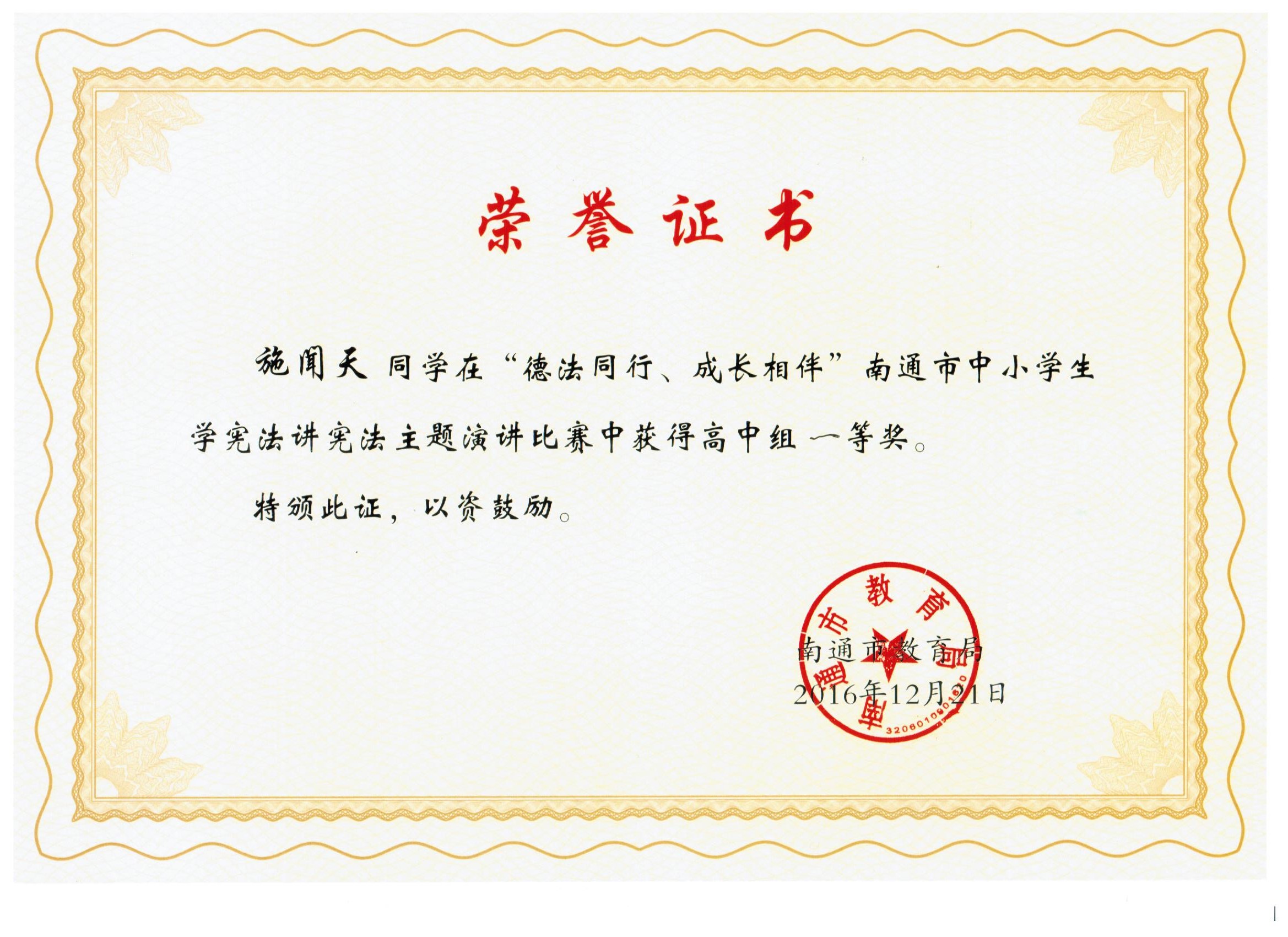 本次比赛共有各县市、区推选的共计30多为选手,比赛分小学组、初中组和高中组同时段分三个场地进行。经过专家组现场打分,我校施闻天同学在刘丹老师的精心指导下,凭借贴切的演讲内容、富有感染力的演讲技巧征服了在场评委,获得了高中组一等奖。