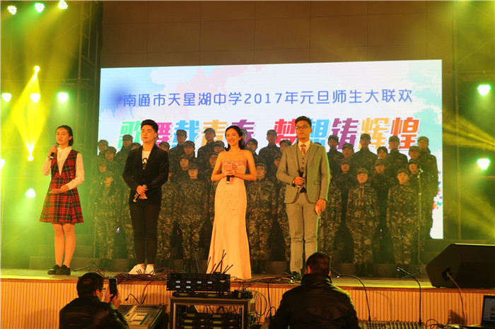 “2017 ,怀揣着璀璨梦想,我们会创造一连串天中的辉煌!”在主持人热情饱满的祝词下,12月29日晚,南通市天星湖中学2017年元旦师生大联欢在学校风雨操场精彩上演。开发区社会事业局黄裕若副局长、沈彬副局长、倪敏副局长,开发区社会事业局教育处季春华处长、郭其红主任,东方中学蒋子平副校长、姚敏副校长,天星湖中学家长委员会代表们莅临现场,与天中师生一起喜迎2017。