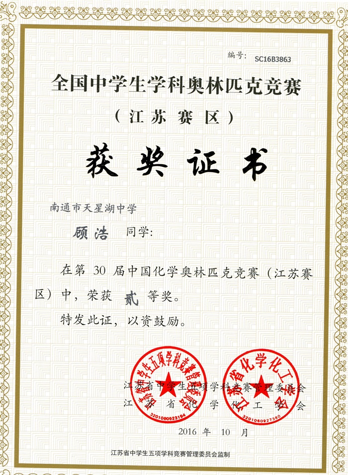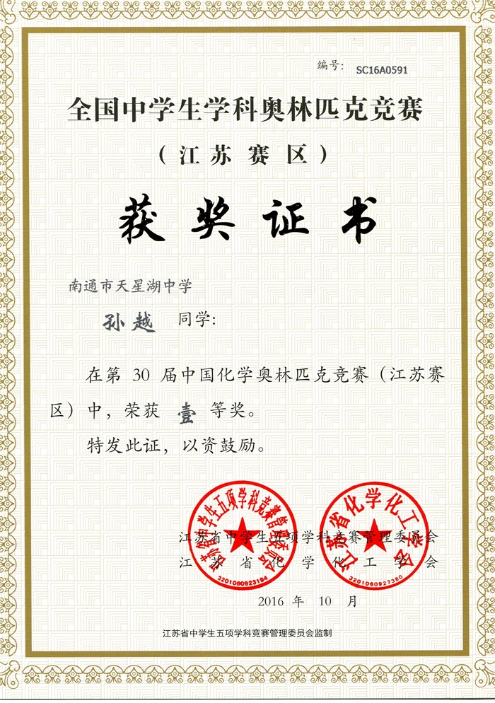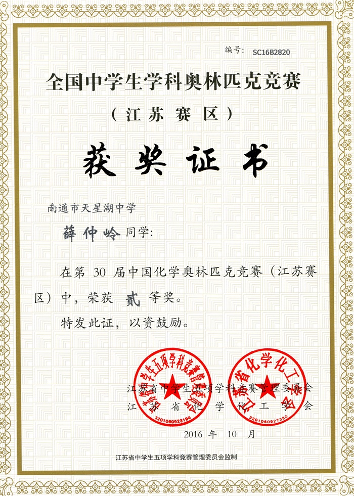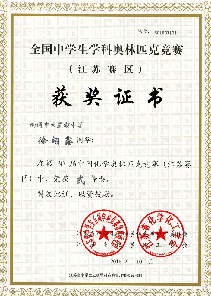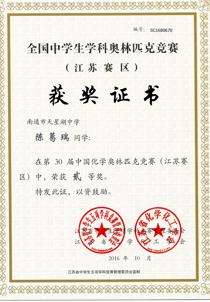 喜报 在30届全国化学奥赛中我校11人获得江苏省二等奖、三等奖