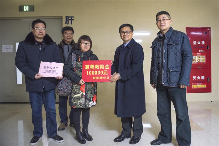 在中山医院重症监护室外,在范主任、区慈善会见证下,谭迪伦先生、陈卫兵总经理代表王子企业向蒋竞群老师的家属捐资十万元人民币,以表达王子企业对蒋老师、对开发区教育事业的一份拳拳爱心;天星湖中学在师生先期捐助十六万元的基础上,又捐助六万两千元,再次表达了全校师生的一片关切和慰问。
