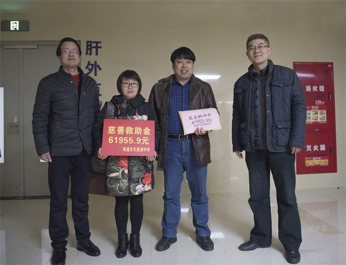 蒋竞群老师是天星湖中学的语文高级教师,爱生敬业,德艺双馨,他是南通市168爱生先进教师、南通开发区优秀教育工作者。去年下半年身体不适,十一月底,经上海中山医院诊断,是恶性肝肿瘤,需要进行肝脏移植手术才能彻底根治。天中师生积极捐款,并发动社会人士资助。蒋老师腊月二十九顺利进行了肝脏移植手术。目前蒋老师面色平和,身体状况良好,各项指标正常。