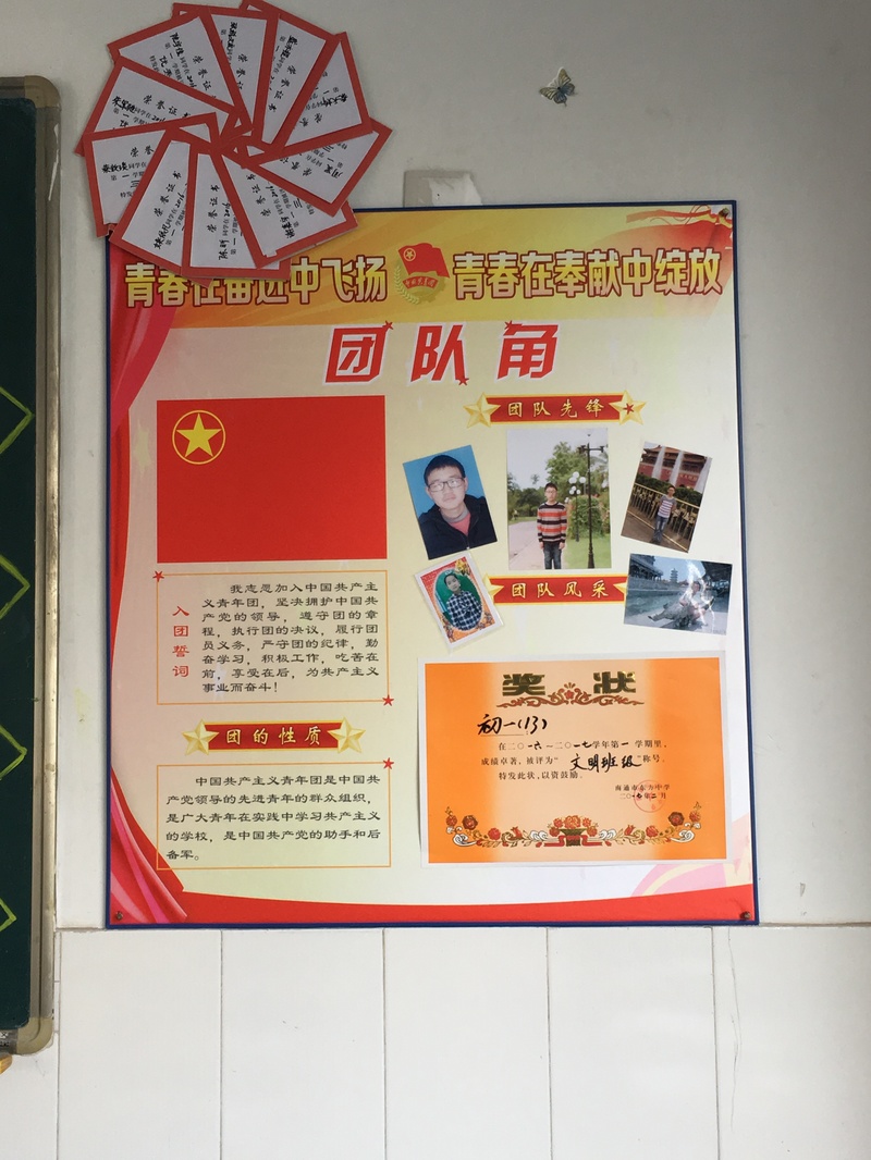 活动中,各团队纷纷通过学生照片、学生作品展现班级团员学生的精神风貌,不少班级还将班级口号、班级公约纳入其中,丰富“团队角”的内容。