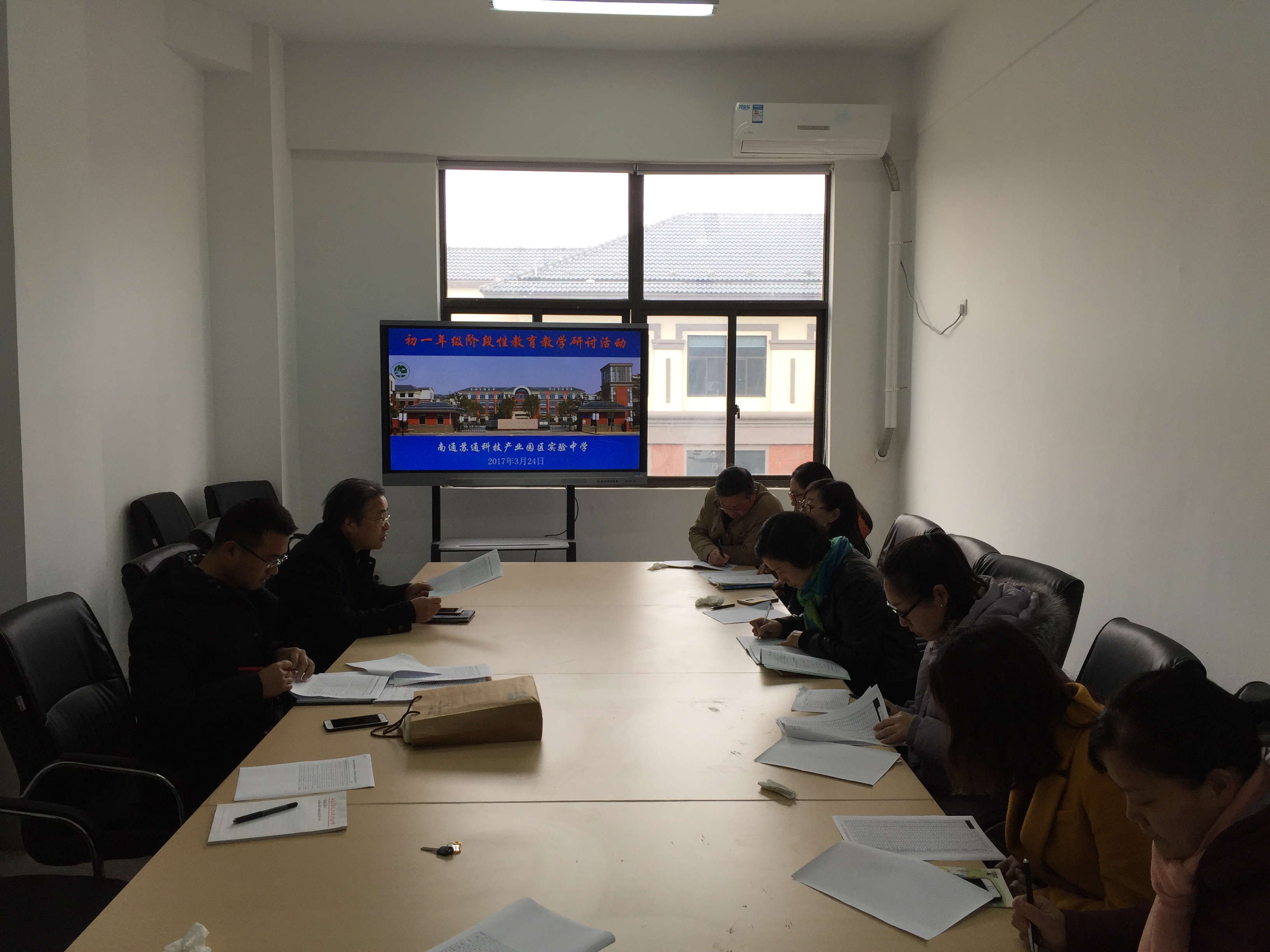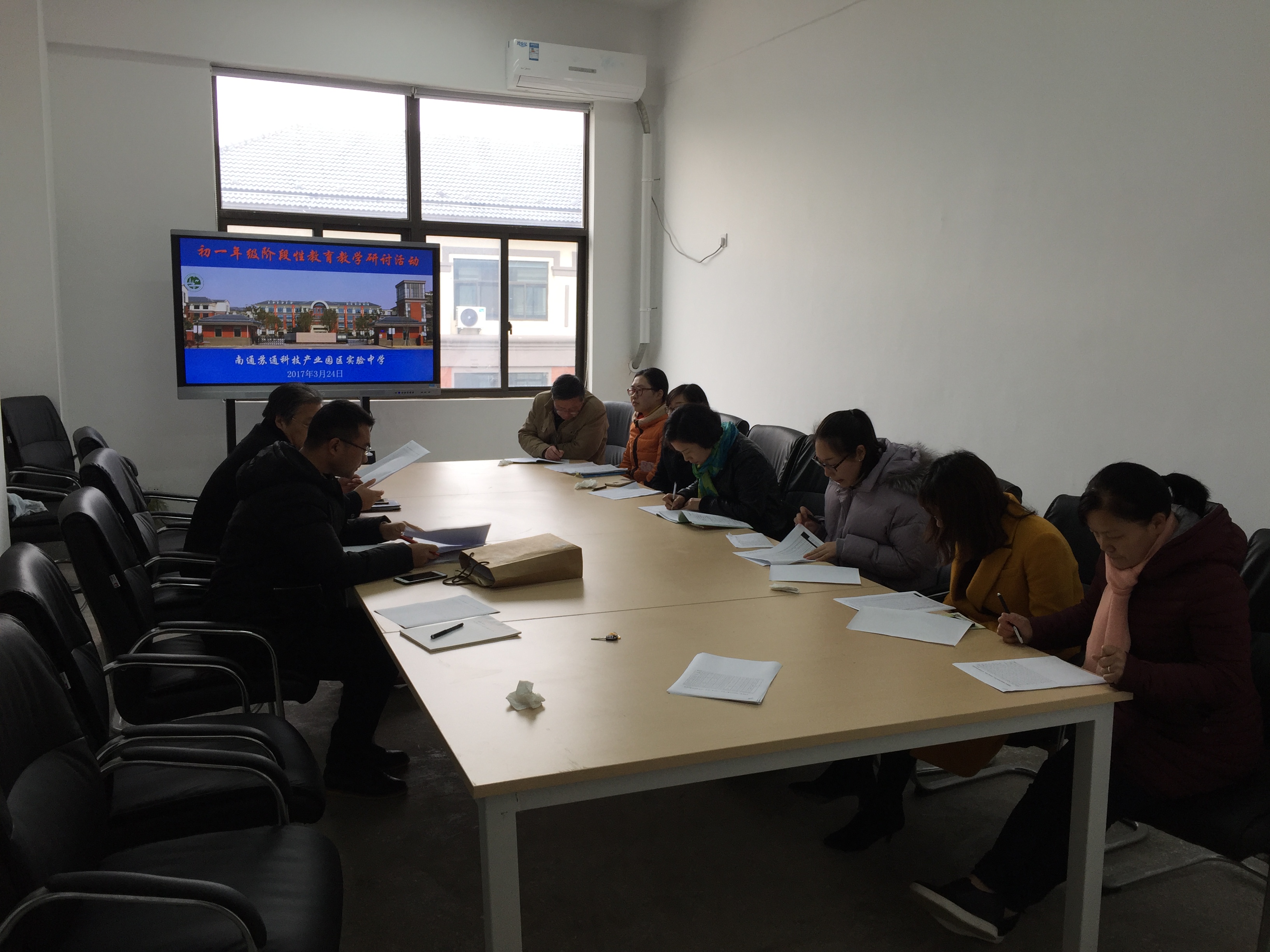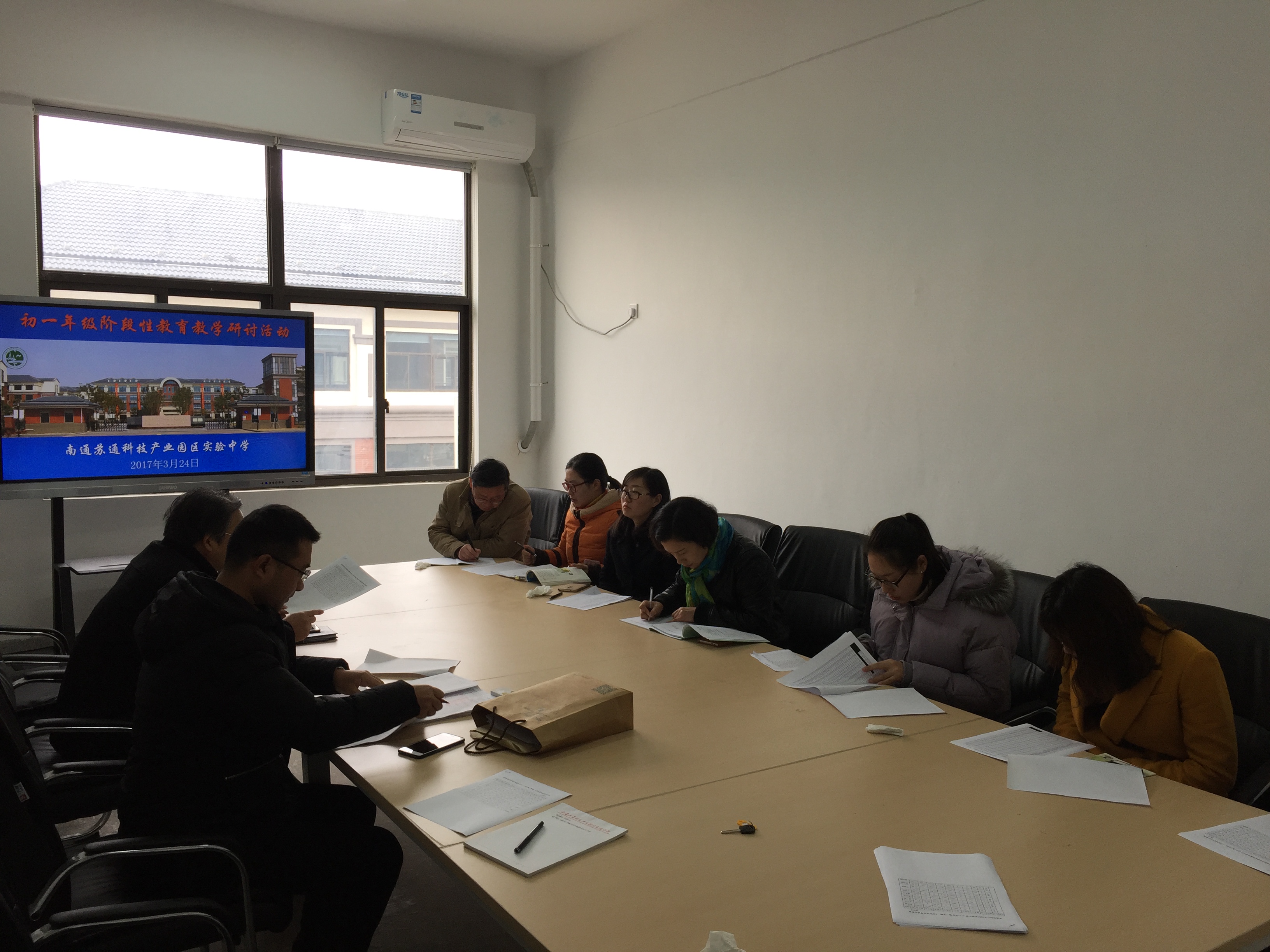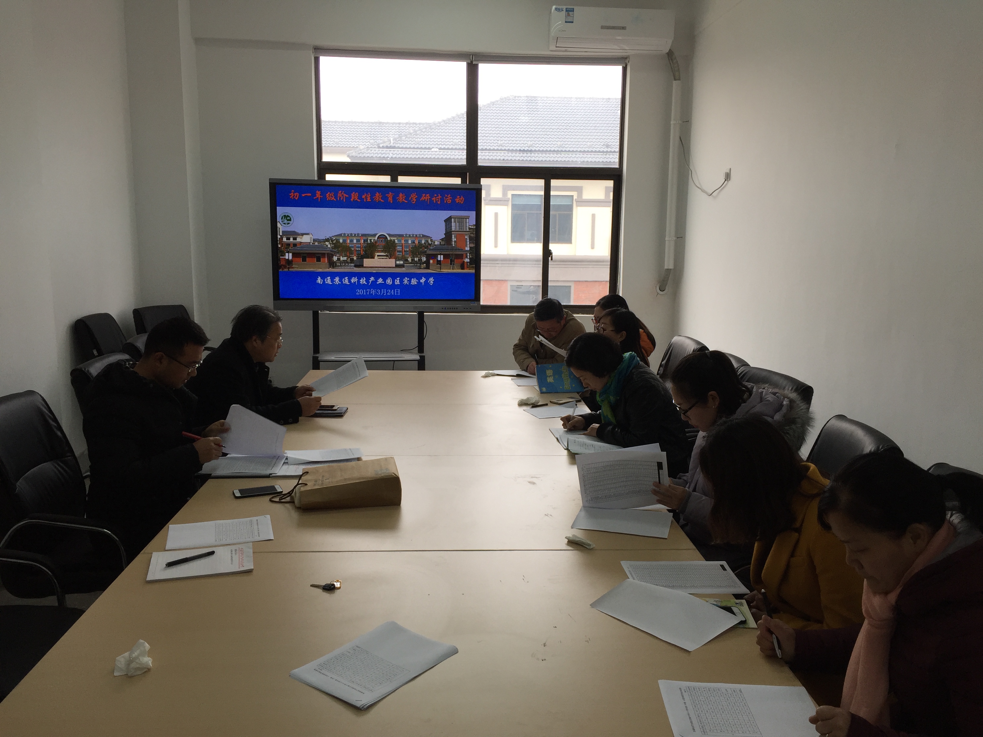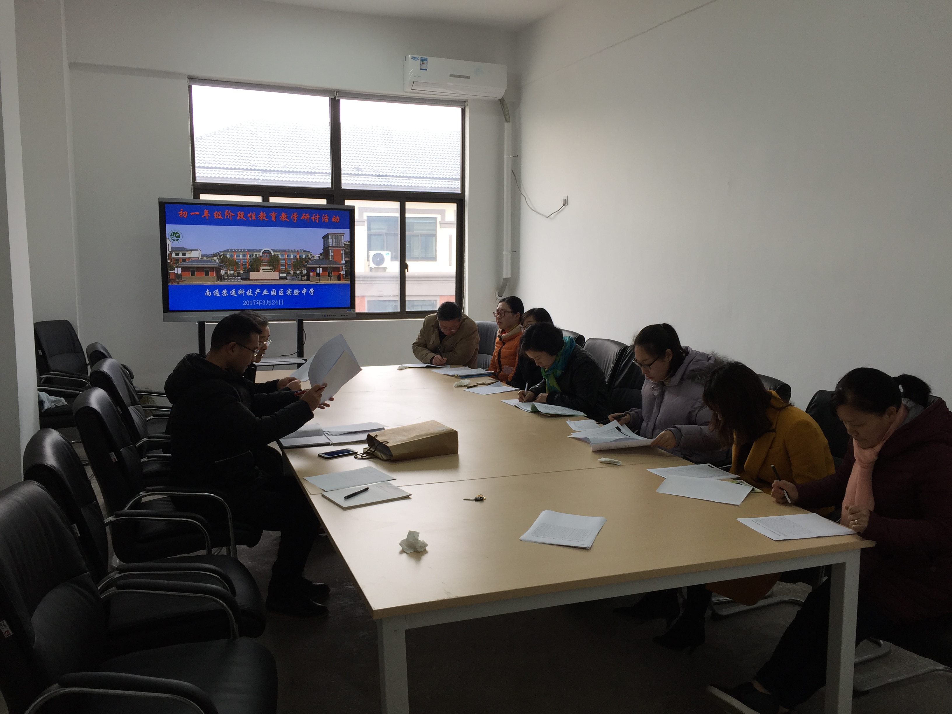 2017年3月24日,南通苏通科技产业园区实验中学举行初一阶段性教育教学研讨活动。沈明明校长主持会议,与会教师积极讨论初一年级在现阶段的教育教学中遇到的问题,并商讨解决的方法。