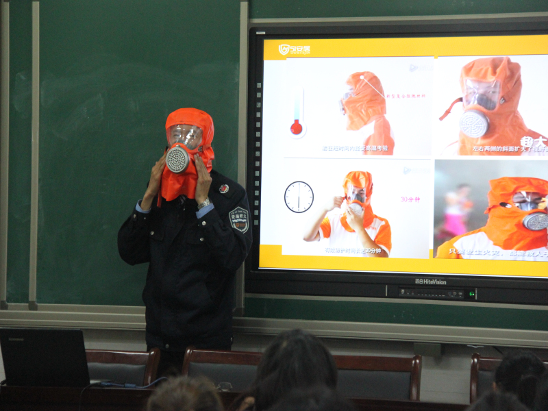 王教员主要从救火的误区、如何自救、个人及单位的火灾预防等几个方面讲述,并结合近年来发生在全国各地的大小火灾事例,结合PPT形式,对火灾发生时的疏散逃生技能、家庭火灾隐患、自救他救技巧作了生动精彩的讲解;王教员还对生活中常见的消防误区做出重要提醒,例如:住宾馆时应查看逃生通道所在位置以及乘坐大巴时观察逃生锤放置位置,以便不测时使用。此外刘教员更是现场演示了新型呼吸器的使用方法,切实加强了我校教师的感性认识。