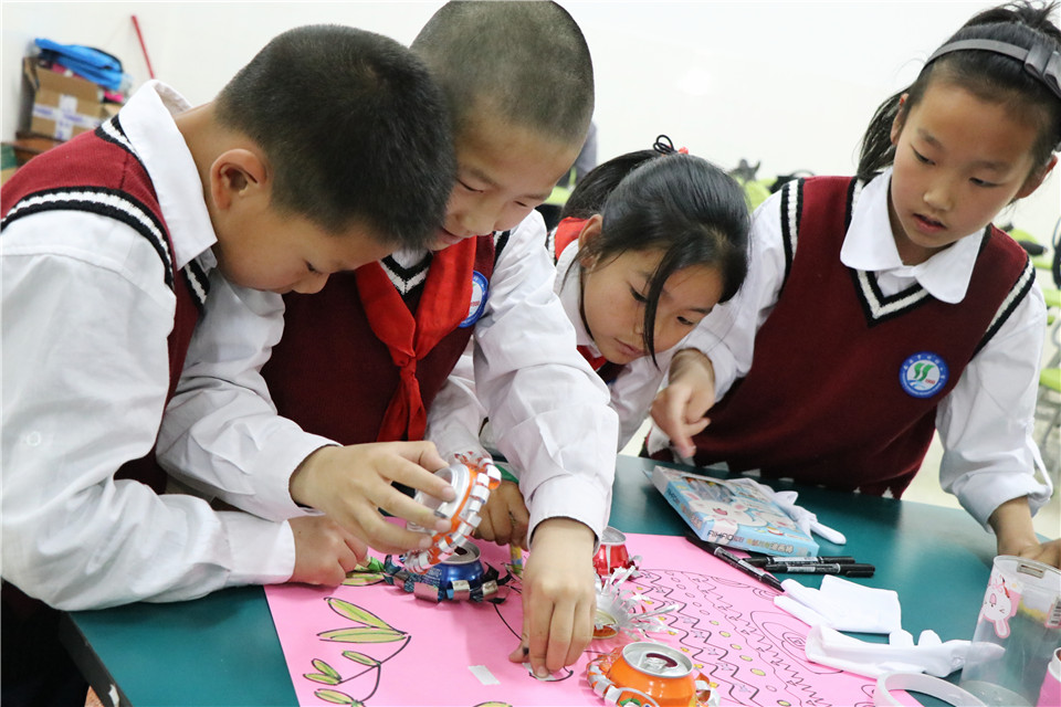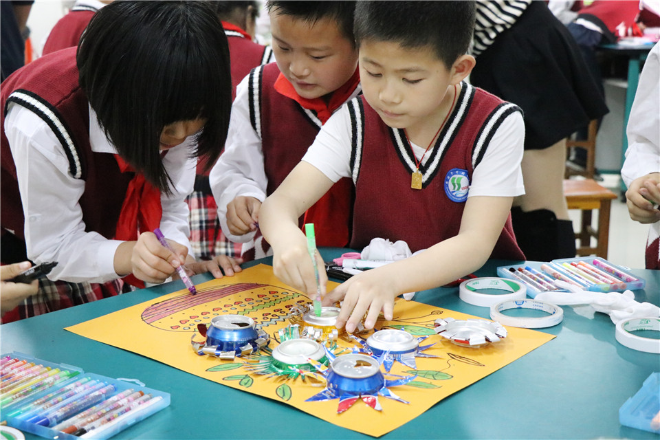 朱金晶老师通过“巧手变废为宝”,教会孩子们利用废弃易拉罐制作精美的易拉罐金属浮雕画。