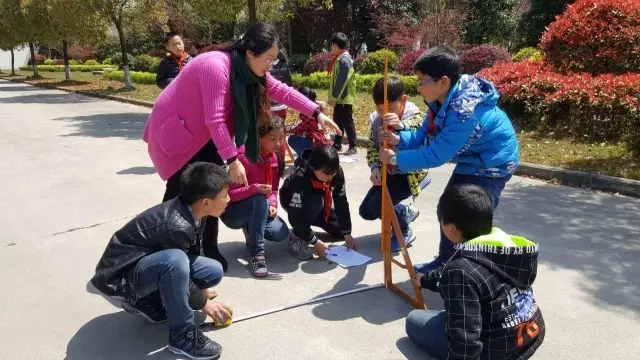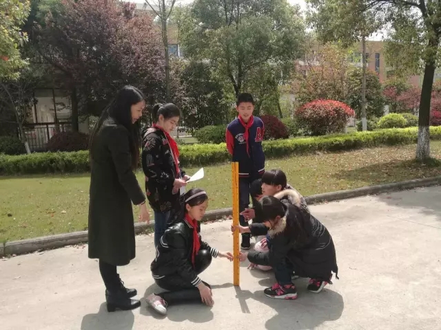 本次活动分为四块内容:一、6人一组利用中午的时间合作测量四根竹竿高度和影子的长度;二、比较测量得到四组竹竿高度和影子长度的数据,发现竹竿有长有短,影长有长有短,竹竿长的影子也长;三、计算竹竿长度和影子长度的比,发现同一时间,同时测量长度不同的竹竿,高度与影长的比值是相等的;四、根据发现的规律计算竹子的高度。