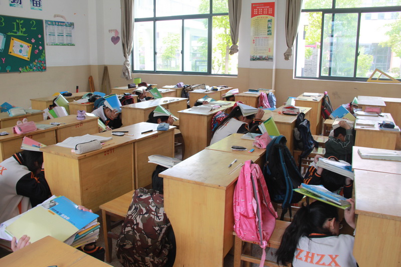 随着一阵急促警报声的响起,全体学生立即做出防震避险反应。在广播提示和老师的指导下,同学们迅速躲在各自的课桌下,抱头或用书本护头,进行室内应急避震。随后在老师的引导下,学生们安全、有序撤离了教学楼,在操场上的指定位置集合。