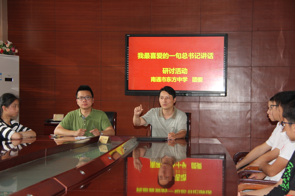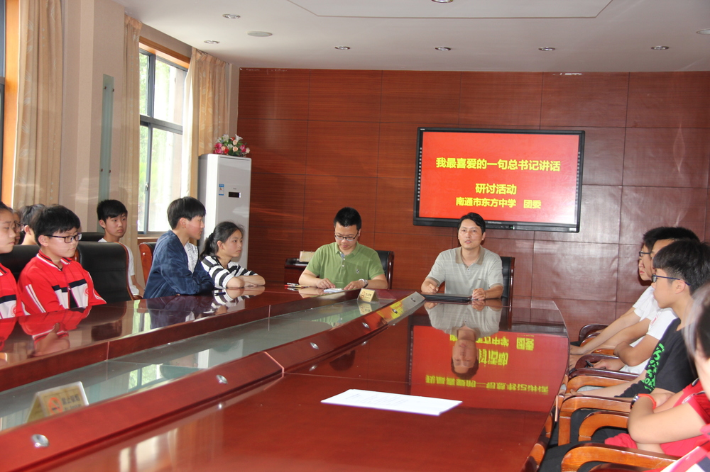 在激情奋斗中绽放青春光芒,在追寻中国梦的征程中放飞青春梦想。6月22日中午,东方中学团委在乐英楼底楼会议室举办了“我最喜爱的习总书记的一句话”主题研讨活动。校团委书记、政教处副主任黄杰老师,团委副书记郭继荣老师和初一年级各支部40多名团员学生一起参加了研讨活动。