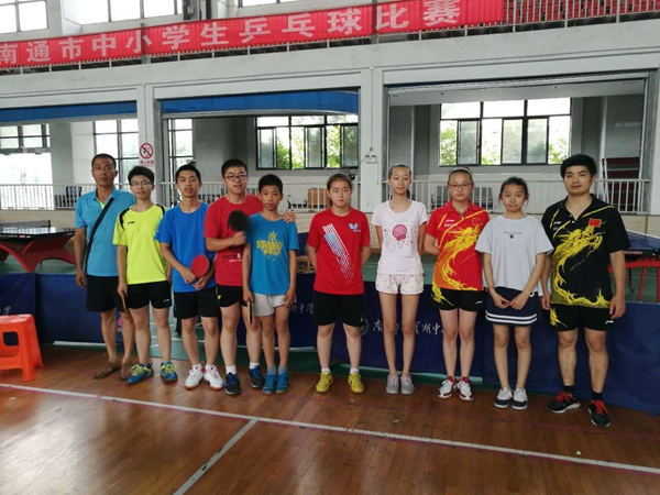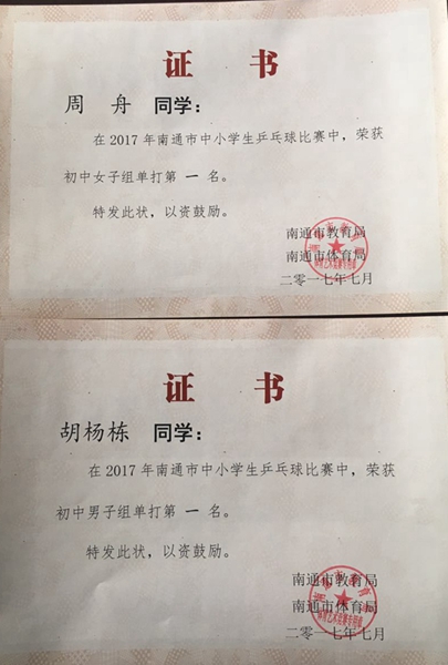 在日前结束的2017年南通市中小学乒乓球比赛中,我校乒乓球运动员获得男子团体冠军,女子团体亚军。其中周舟获得女子单打冠军,胡扬获得男子单打冠军。
