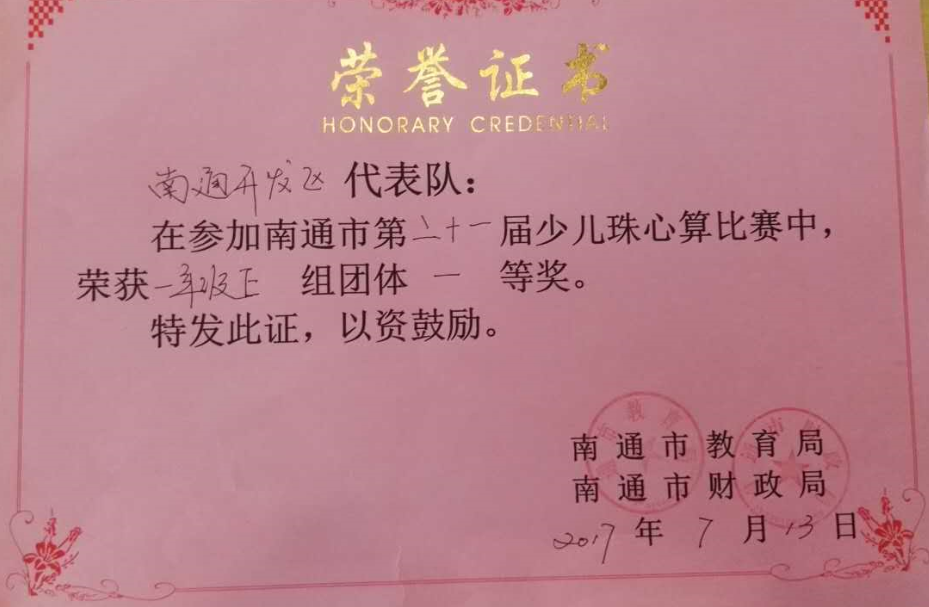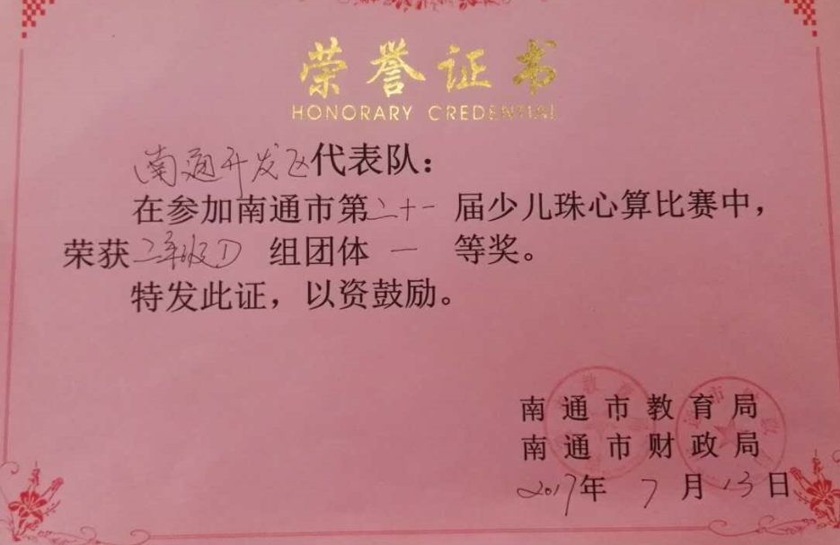 南通市珠心算比赛由南通市教育局、南通市财政局联合主办,每年举办一次,是我市规模最大、级别最高的珠心算大赛,是检阅全市珠心算教育水平的大赛。南通开发区实验小学是江苏省珠心算教育特色学校,在历届南通市、江苏省、全国乃至世界级比赛中均取得过骄人业绩。其中,2014年,黄英琪同学荣获世界级珠心算比赛一等奖;2016年,冒安琪同学荣获世界级珠心算比赛二等奖。