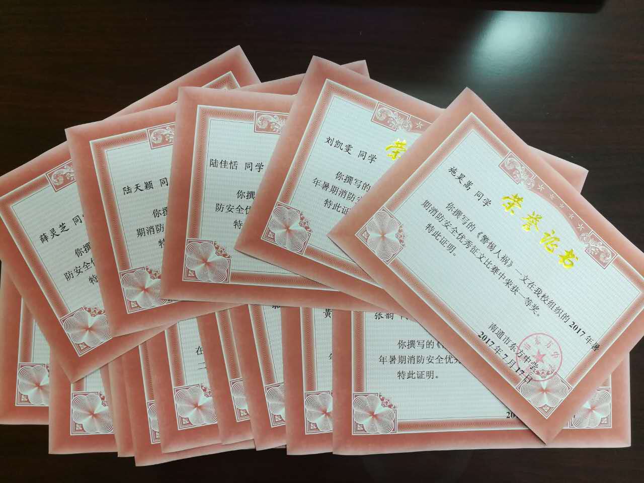 为大力提升学校消防安全管理和宣传教育水平,切实增强师生消防安全素质,根据通开发社【2017】第62号文件精神,暑假期间,东方中学政教处、团委组织初二年级各支部学生开展了暑期消防安全征文比赛,最终初二2施昊嵩等5位同学获得一等奖,初二1张韵等13位学生获得二等奖,具体获奖名单如下: