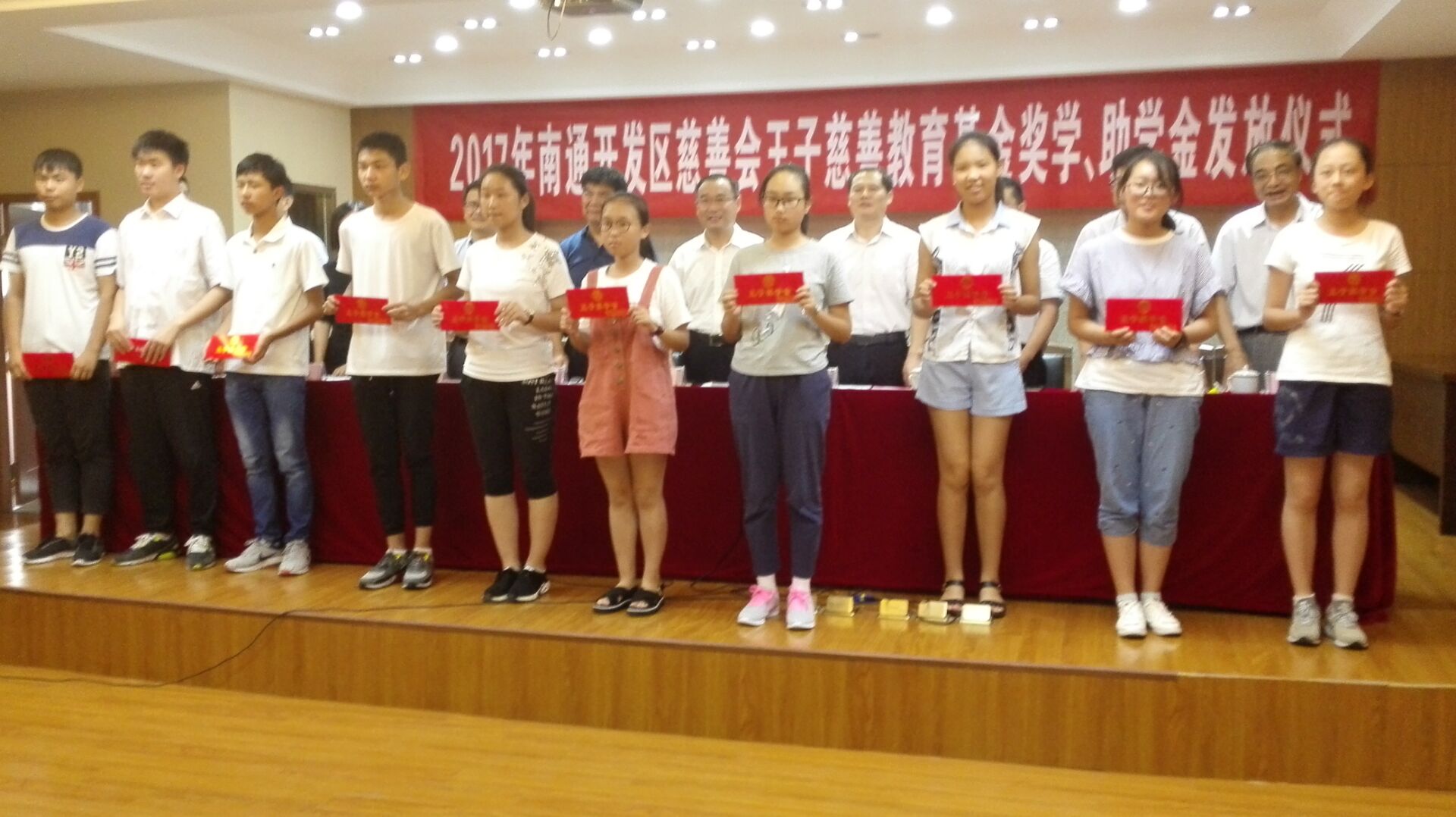 8月24日下午,“2017年南通开发区慈善会王子慈善教育基金奖学、助学金发放仪式”在新开街办举行,我校两位优秀毕业生黄佳磊(左五)、张帆(左四)喜获王子奖学金。