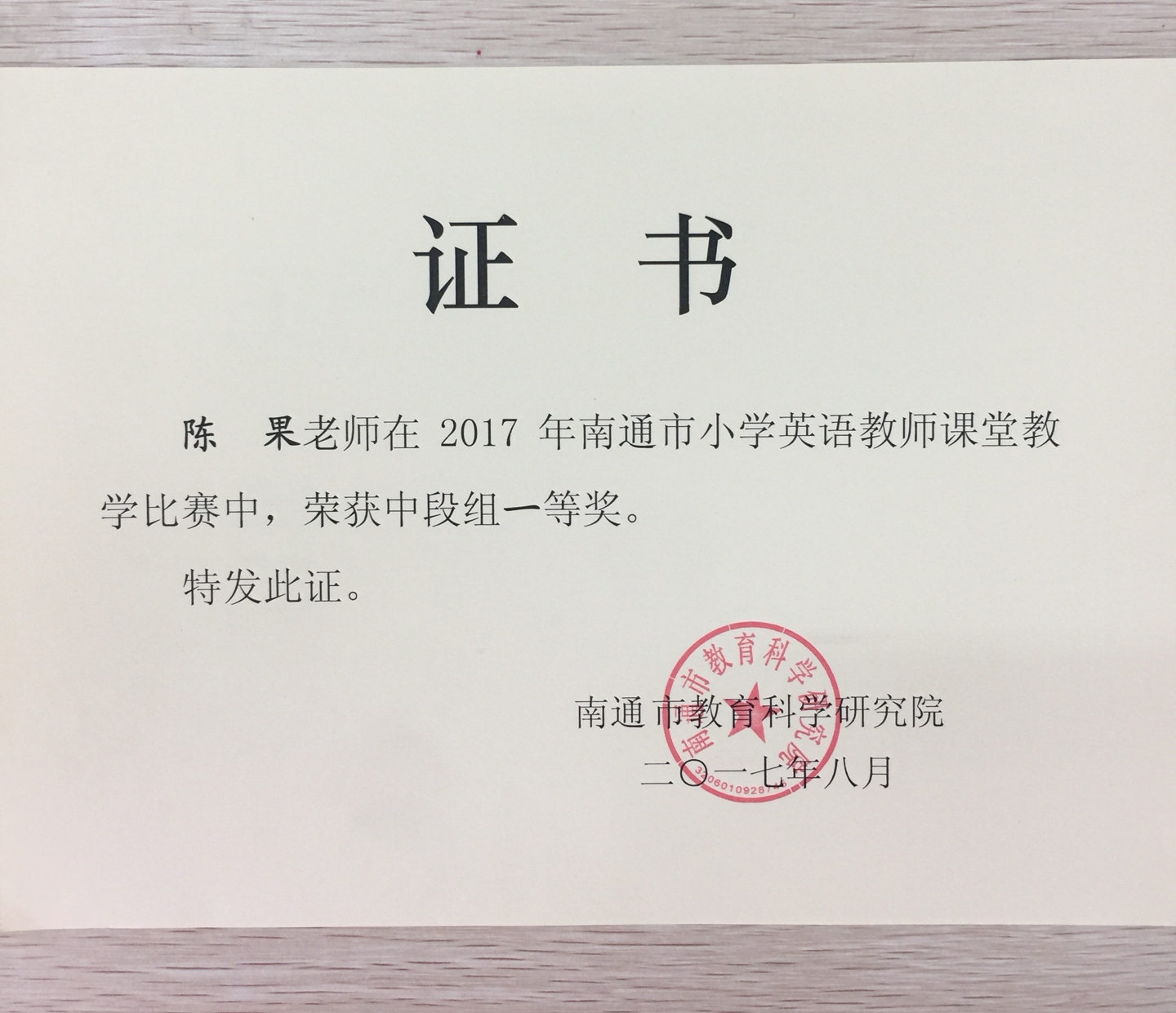 高师附小陈果老师代表南通开发区参加了在如东县掘港小学举行的2017年南通市小学英语教师课堂教学比赛,荣获一等奖。