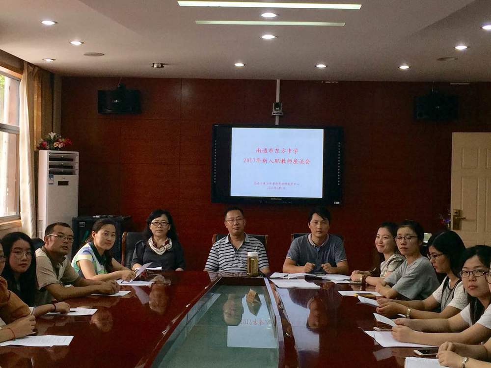 97日中午,东方中学乐英楼底楼会议室气氛温馨,时时爆出阵阵掌声。由南通市东方中学青年教师发展中心组织召开的东方中学2017年新入职教师座谈会在这里隆重举行,戴继华校长、教务处郭小平主任以及今年暑期新入职的16位教师和前期优秀成员代表一起出席了会议。会议由校团委书记兼政教处副主任黄杰老师主持。