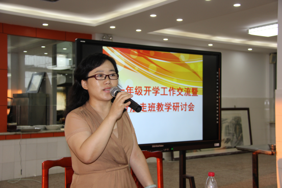 顾建兵副校长首先指出召开此会议的原因和重要性。接着由负责初一级部教学的教务处郭继荣老师就目前初一分层走班教学在教学和管理等方面交流了具体的想法。郭继荣老师首先点赞初一“三有”教师:做有思想、有方法、有效果的老师;第二提出日常管理要有吃苦意识。第三指出教学方面要有研究意识。然后政教处张建华老师回顾了开学开展的工作,部署接下来要落实的举措。他希望大家能克服困难,团结协作,不断创新,为把我校发展为南通有地位、省内有影响的名校而共同努力!教务处郭小平主任从宏观层面分析了分层走班意义所在,又从微观方面提出具体可行的措施:分别从备课、授课、作业、辅导等教学环节作出了具体的说明。她指出我校将继续深化课改,使每个学生在东方中学都能拥有自己高增量成长的节奏。最后教师代表分别从班级管理、师生关系、课堂教学、自习课管理等方面交流了自己在分层走班教学中的部分想法。