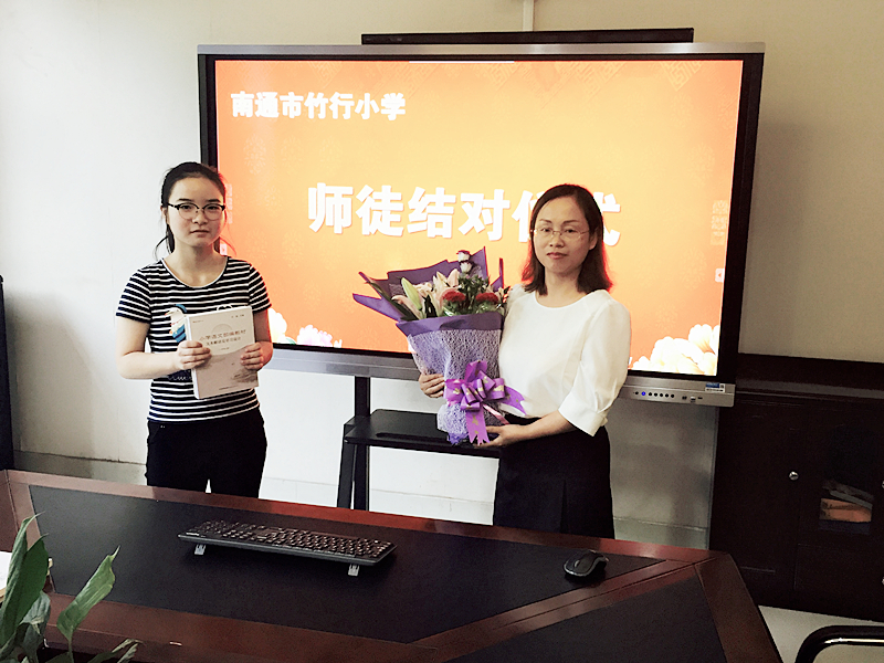 首先戴亚兵副校长发表讲话 ,他表示竹小一贯重视对青年教师的培养 ,会选择有经验的优秀教师帮助新教师开展一帮一、师徒结对“青蓝工程”,旨在“青出于蓝而胜于蓝”,力争使青年教师“一年适应、三年成熟、五年挑大梁”。之后黄凯主任宣布了师徒结对名单 ,朱军校长为指导教师颁发了聘书。在本次仪式上,共有5对教师完成师徒对接,他们在庄严的气氛中签订了帮教结对协议。五位师傅分别向自己的徒弟赠送了关于专业发展的新书 ,徒弟们也为师傅献上鲜花。