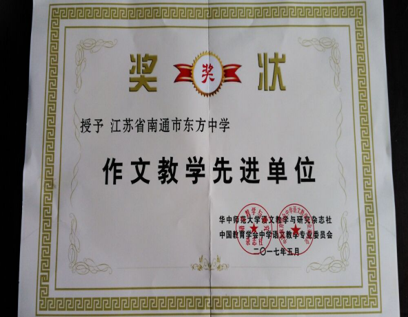 20175月,在第十八届“新世纪”杯全国中学生作文大赛中,我校选手成绩喜人,经过大赛组委会认真评选,我校徐文杰、蔡升阳、刘星雨三名同学荣获第十八届“新世纪”杯全国中学生作文大赛初中组全国总决赛二等奖,刘梦娇、秦添添、张玮杰、陈奕腾、顾袁媛、倪王磊、董皛、曹季晴、徐洋、倪采、陆天颖、沈姝含、吴飞霄、张玮洁荣获三等奖。 我校被中语会、语文教学与研究杂志社联合授予“作文教学先进单位”荣誉称号。