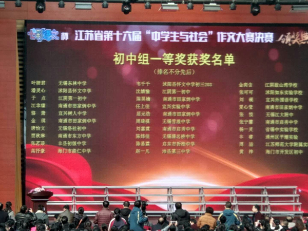 2017年12月2日,由 江苏省教育学会中语会、江苏省中小学教学研究室、《七彩语文》杂志社联合主办的“七彩语文杯”江苏省十六届“中学生与社会”作文大赛省级决赛于在南京市金陵中学河西分校举行。我校贾秋琳同学荣获初中组一等奖(指导老师 徐东),张韵、徐施诗、于乐三位同学均获得初中组二等奖(指导老师分别是顾惠、蔡天翼、何忠伟)。这四位同学不久前参加了在南通市跃龙中学举行的市级中学生作文大赛中,均获得南通市(大市)作文大赛初中组一等奖。这是我校作文教学的又一突破,也是分层走班教学改革探索中所取得的又一个新的成果。