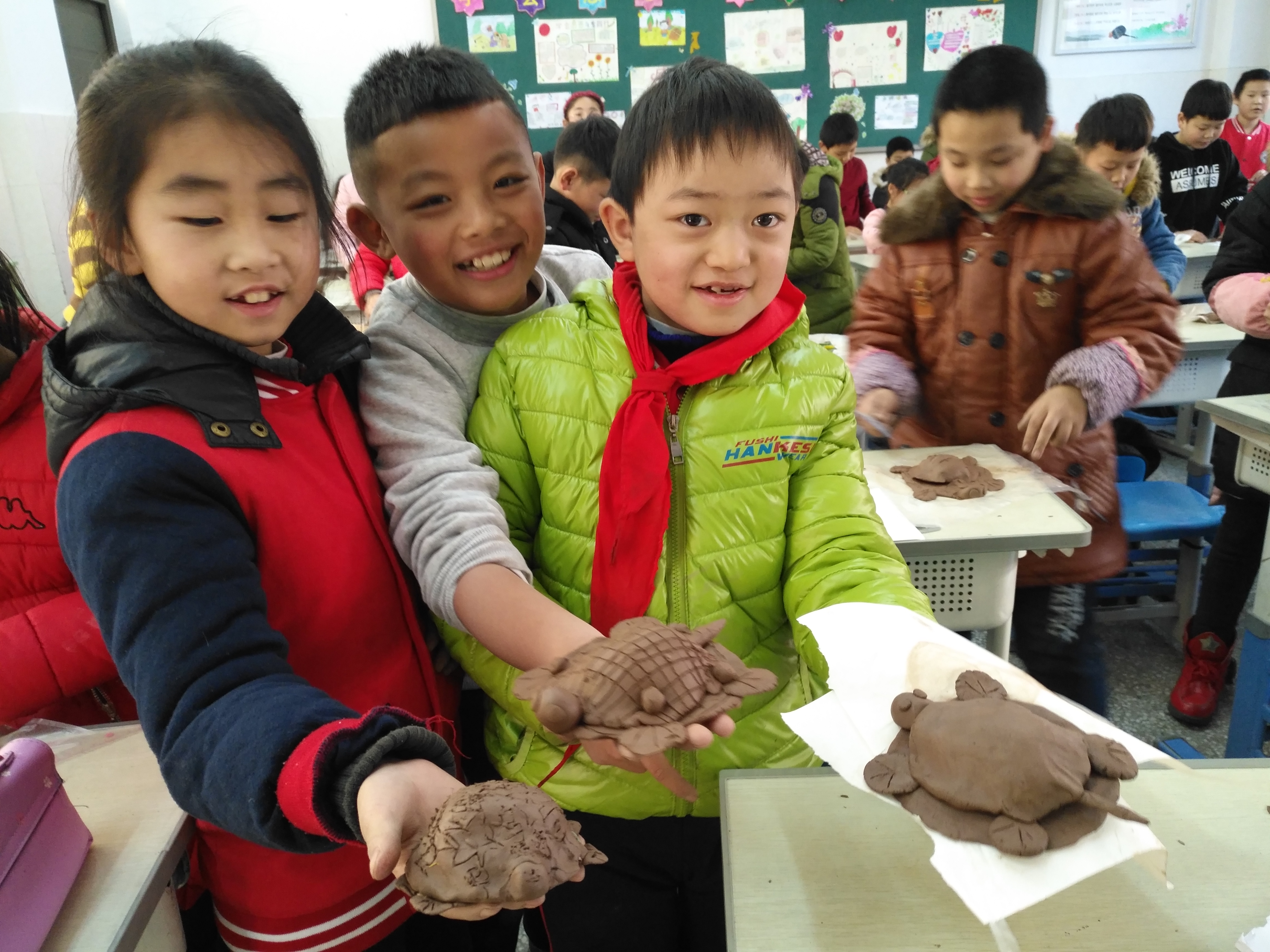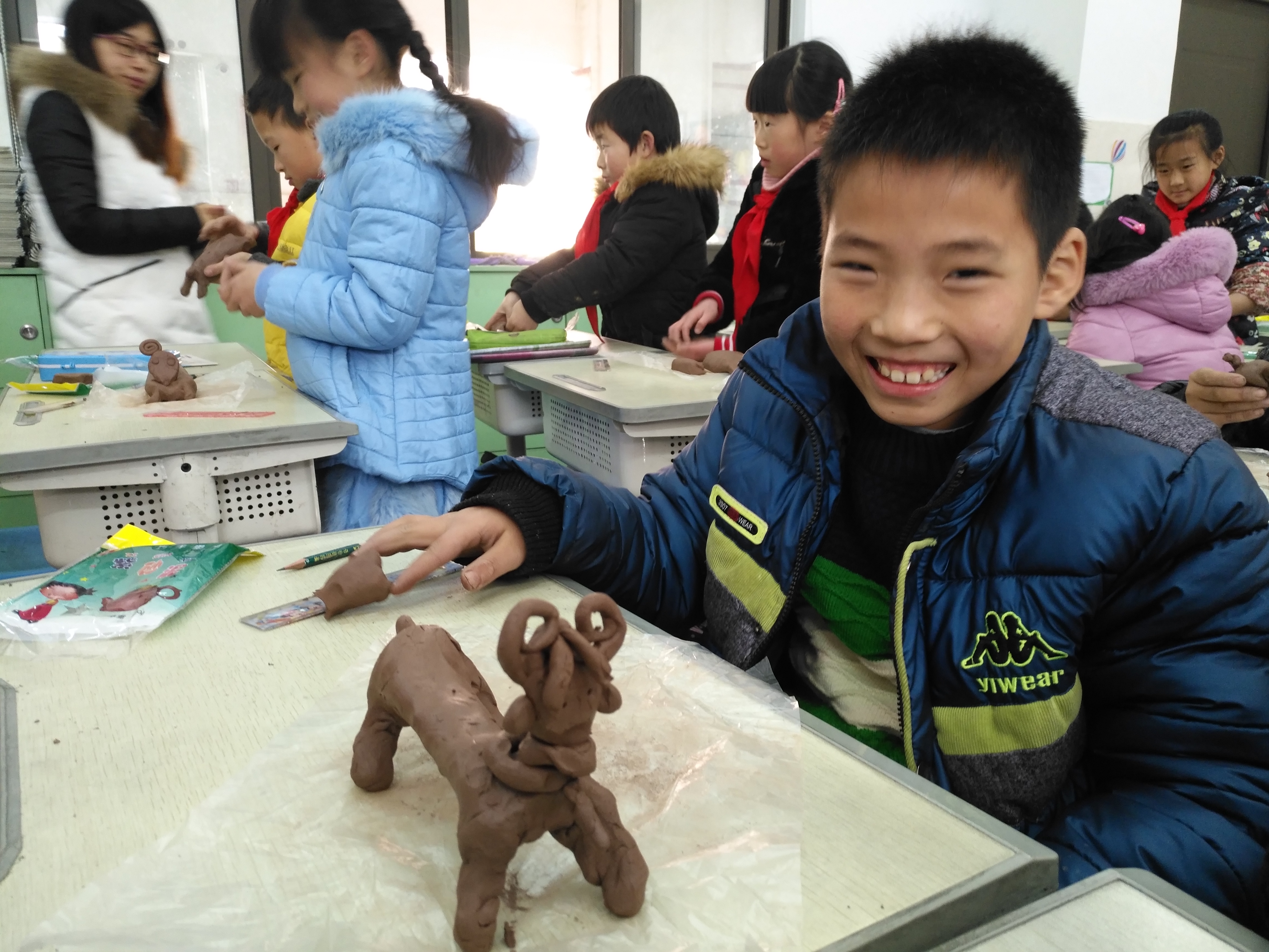 来自陶艺培训中心的老师们,早早来到学生们身边,讲解陶泥作品的制作步骤,还为大家示范陶艺制作方法,学生们兴味盎然,有的捏下一小块陶泥,放在手心里来回地揉搓,终于变成了一只羊角,有的拿出小刀,细心地刻画着海龟背甲上的线条,有的将陶泥摊在桌上,又是压又是锤,好不容易把它变成了一片沙滩,再将可爱的海龟慢慢放在沙滩上,仿佛那只海龟已快乐地游向大海,孩子们的想象力真是无限丰富,做出的山羊栩栩如生,这只山羊睡着了,那只山羊跳起来了,还有一只没睁开眼睛的小水牛,牛背上的孩童如此可爱,陶醉在陶艺的世界里。