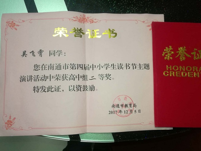12月5日下午,来自南通各县市的中小学生代表,齐聚在新华书店凤凰书城,参加南通市第四届中小学生读书节主题演讲比赛。我校吴飞霄同学以总分第三名的成绩获得高中组二等奖。