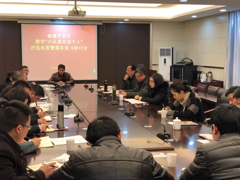 1月5日上午,开发区各中小学教学校长、教务主任齐聚区教师发展中心三楼会议室,共同谋划期末教学工作。会议由教师发展中心杨苏主任主持,他着重诠释了2017年度南通开发区 “教学六认真”先进个人评选方案,期末复习课的要求,以及期末考试的安排。教师发展中心教学研究与质量监测部杨玉栋老师就南通开发区 “教学六认真”量化管理考核细则(试行稿)做了解读。各中小学教学校长交流了期末复习安排。最后,社会事业局倪敏副局长讲话。她实事求是地总结了本学期教育教学工作取得的成绩与存在的问题,要求全体教学管理人员在学期结束阶段一要密切关注师生的教与学。不搞无选择无重点的试题轰炸,不搞只考试不批阅的复习,不搞重复无用的抄写甚至罚抄。二要认真组织期末调研测试。认真命题、认真制卷、认真监考、认真分析,切实做好发展性评价。三要组织好2017年度 “教学六认真”先进个人评选,宁缺毋滥,突出导向与引领作用。倪局长要求参会同志就如何进一步提高各单位教育教学质量这一主题进行深入思考,要求在新学期第一次教学工作会议上交流。