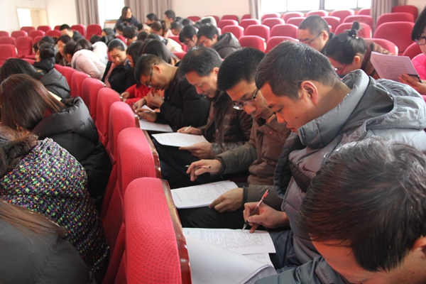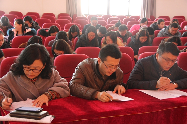 本次活动在学校第二阶梯教室举行,考试采用闭卷形式,测试内容包括《中国共产党章程》、十九大报告精神的内容。测试现场,全体党员教师认真思考作答,在规定的60分钟答题时间内全部完成。