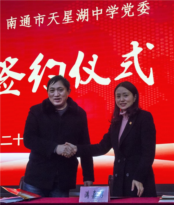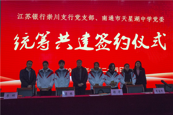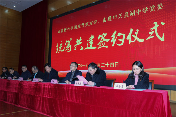 为了创新党建工作形式,将基层党建工作真正落到实处,1月24日下午江苏银行崇川支行党支部和南通市天星湖中学党委统筹共建签约仪式在我校滋兰楼报告厅隆重举行。南通市开发区党工委委员、组织部部长、人社局局长曹海锋、社会事业局党组书记、局长邵平、江苏银行南通分行党委委员、纪委书记、副行长姜洪飞、江苏银行南通分行党群工作部部长李明、江苏银行崇川支行行长满嘉男和我校徐新民校长、朱卫东副校长一起参加了签约仪式。