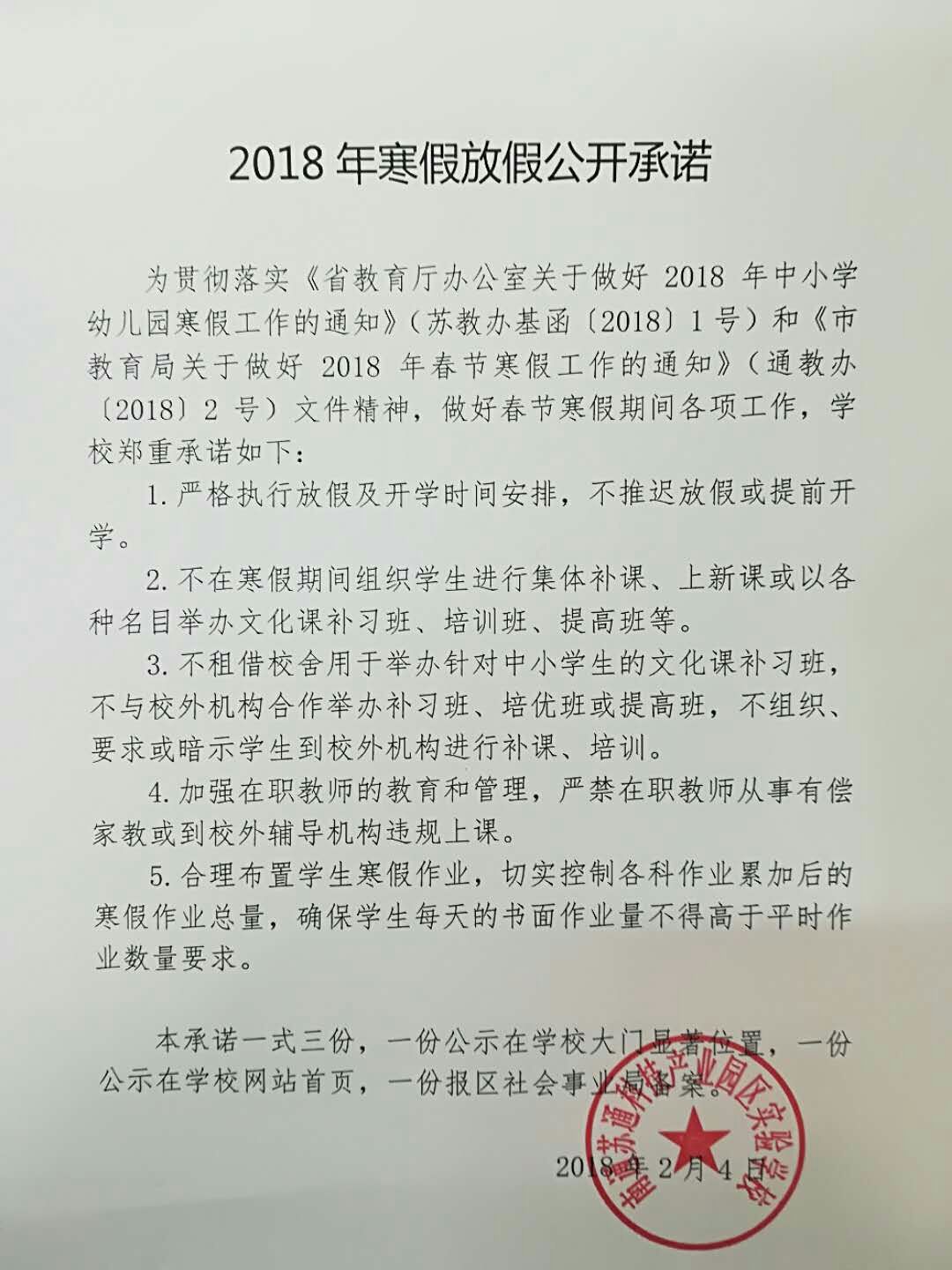 2018年寒假放假公开承诺