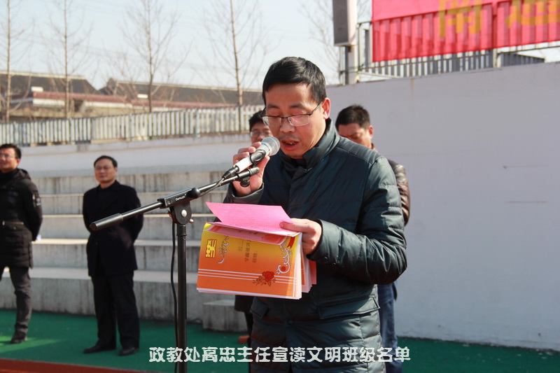 聆听嘹亮的国歌声,仰望冉冉升起的五星红旗,2018年春季开学典礼开始了。升旗仪式结束后,教务处陈达主任宣读了上学期优秀学生、校园之星的表彰名单,政教处高忠主任宣读了文明班级和优秀班主任的表彰名单,随后校领导为获奖师生颁发了奖状,并与他们合影留念。