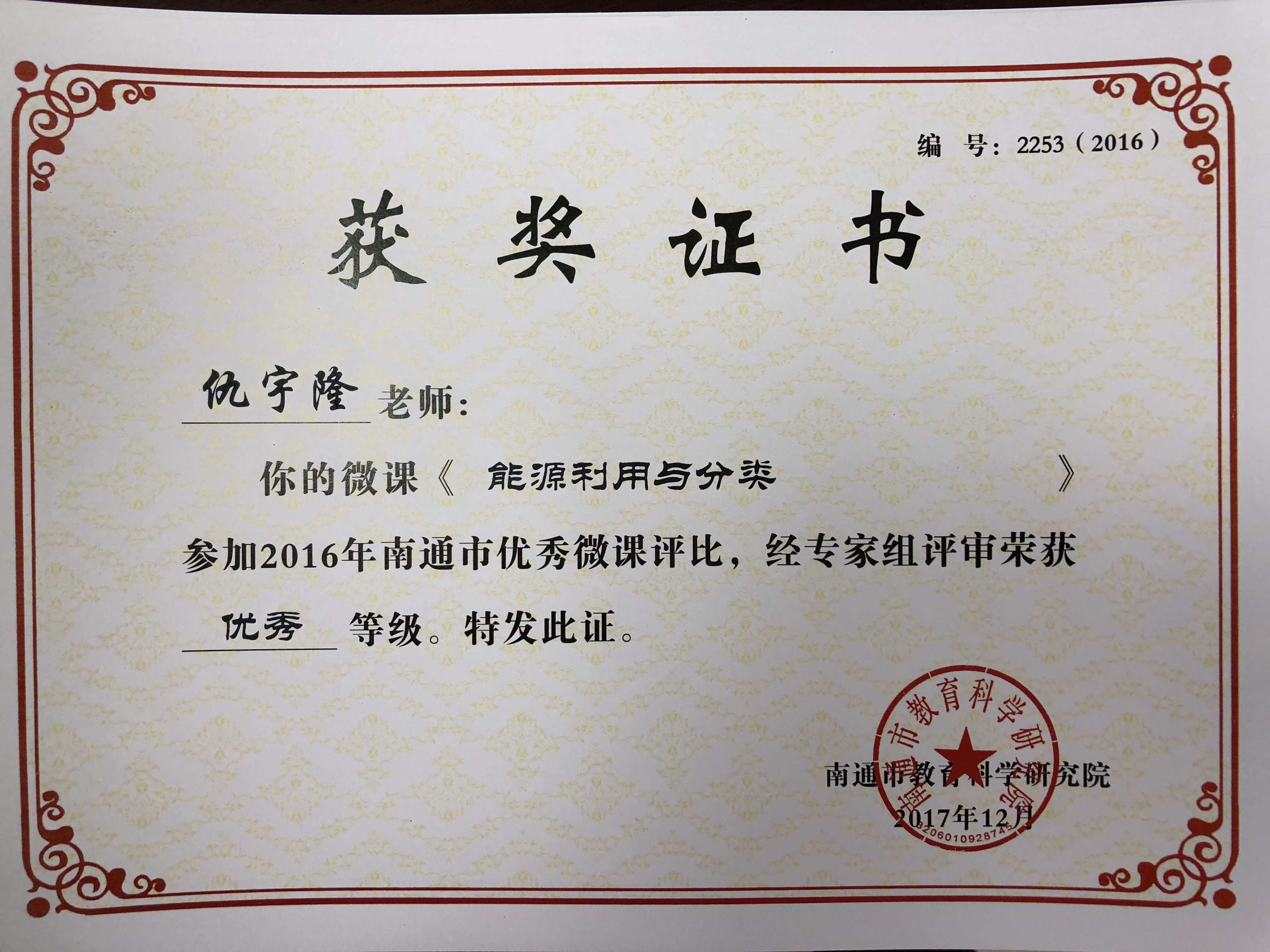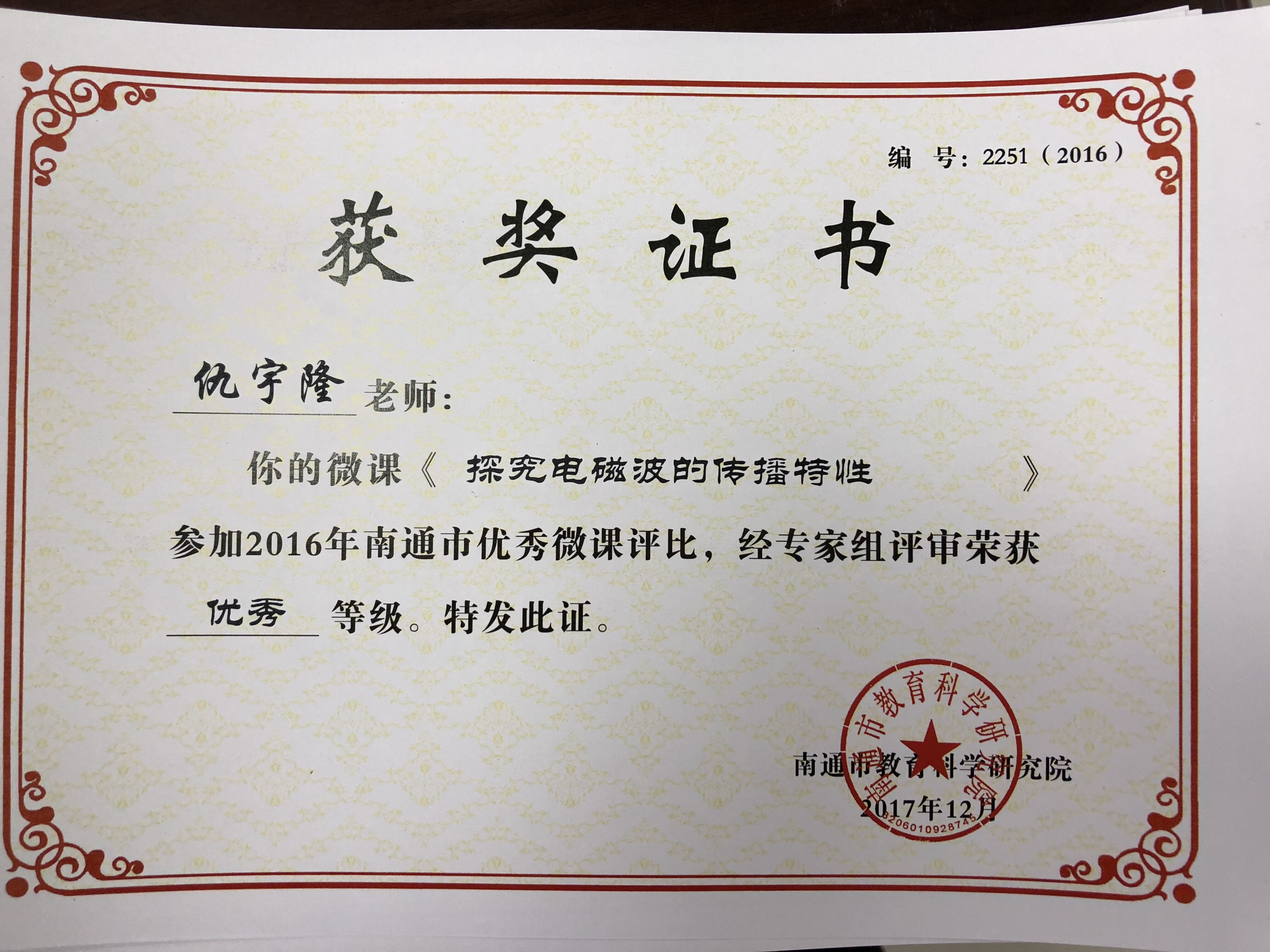 我校仇宇隆老师的两节微课《探究电磁波的传播特性》和《能源的利用与分类》在南通市优秀微课评比中荣获优秀等级。