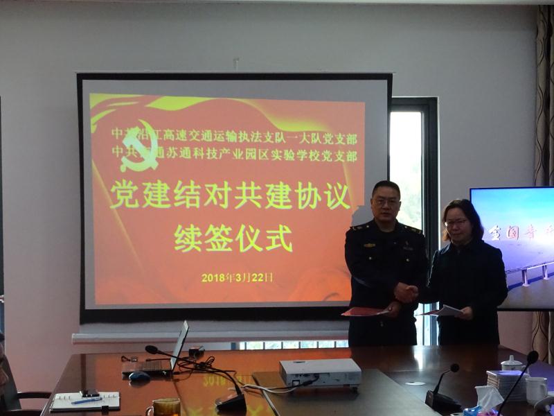 2018年3月22日上午,苏通园区实验学校党支部委员一行在姚敏书记的带领下来到江苏省高速公路交通运输沿江支队第一大队,参加结对共建续签仪式。这是两个支部继2016年结对共建后再度续约。