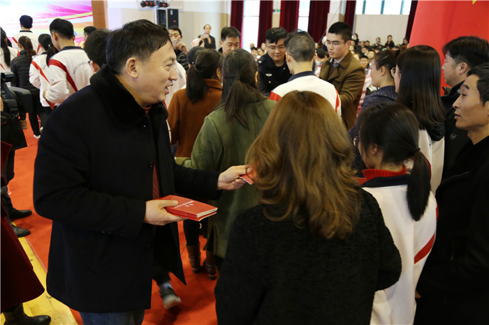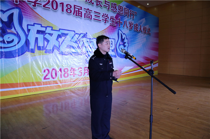 仪式上开发区新开镇团工委姜来明书记给新公民们送来了精神食粮,新开派出所丁海波副所长、学校徐新民校长都饱含深情地给在场的学生送上真诚的祝福和拳拳的鞭策;学生们的诗朗诵《我十八岁了》誓言铮铮、激情澎湃,道出了天中学子的豪情万丈;之后所有高三学生在家长的引领下,迈着坚实的步伐、怀着激动的心情通过“成人门”,并从徐新民校长等领导手中接过成人徽章和《中华人民共和国宪法》单行本;随后全体高三学生在教务处赖军主任的带领下面对鲜艳的五星红旗进行了十八岁成人宣誓。学生代表俞尧、家长代表姚敏女士做了发言,表达了对领导和老师的感激之情。