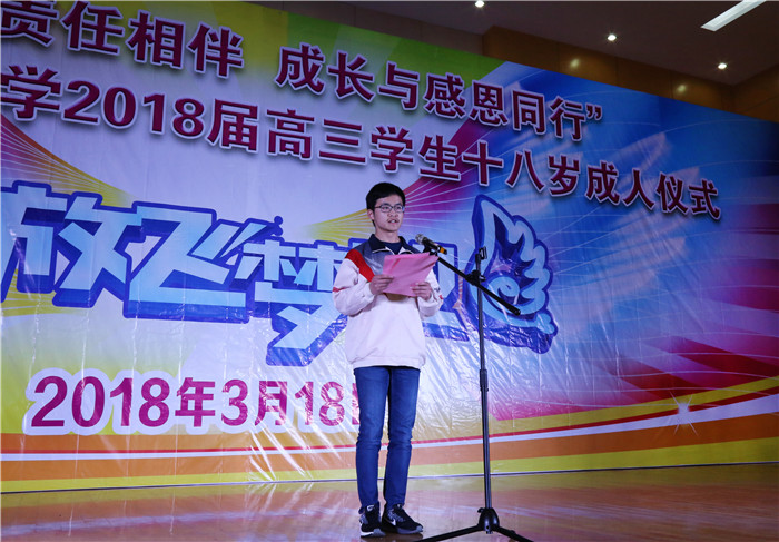 3月18日下午,“青春与责任相伴 成长与感恩同行”南通市天星湖中学2018届高三学生成人仪式在学校风雨操场隆重举行。