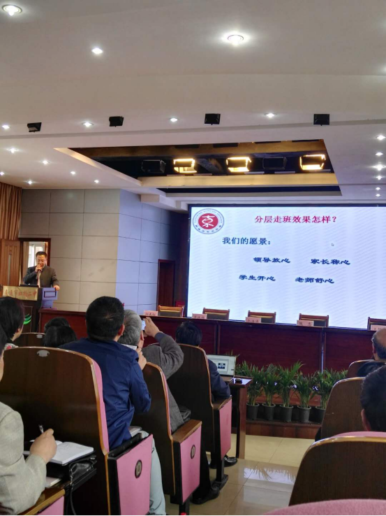 戴校长主要从“为什么要分层走班”、“如何分层走班”、“分层走班效果怎样”三个方面向与会者做了我校经验介绍的专题报告。戴校长指出,实施分层走班,办适合的教育后,我们学校的教师发展有了新路径,学生成长有了新突破,教育管理有了新定位,环境建设有了新思维,课堂课程有了新样态,家校共育有了新秩序。戴校长的报告精彩纷呈,既有理论高度,又有较强的操作性,得到了省教研室领导和南通市教育局金海清副局长的高度肯定。