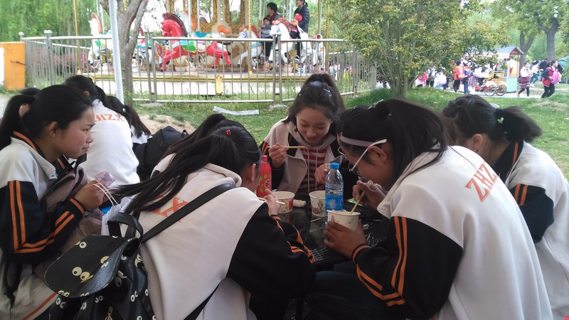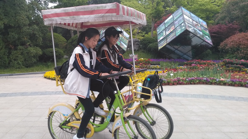 学生们在老师指挥下有序进入啬园,随后以小组为单位开始自由活动。他们有的去欣赏满园姹紫嫣红的郁金香花,有的去逗玩水中的金鱼,有的租辆自行车骑行起来,还有的学生三三两两散坐在树林间或草坪上,边吃着零食,边聊着天,尽享这短暂而惬意的时光。此时春光软软,清风吹拂,更增添了学生们游玩的热情。