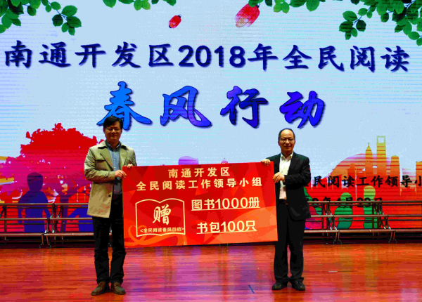 南通开发区社会事业局局长邵平先生代表开发区领导为学校孩子送来了一笔宝贵的精神财富——1000册图书和100只书包,曹立聪校长代表全体学生接下了这满怀着领导对少年儿童的无限关心和关爱的图书和书包。