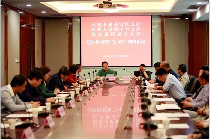 4月20日下午,民盟天星湖中学支部、民建开发区支部、民进通师高专支部在南通经济技术开发区管委会联合举办纪念中共中央“五一口号”发布70周年座谈会。