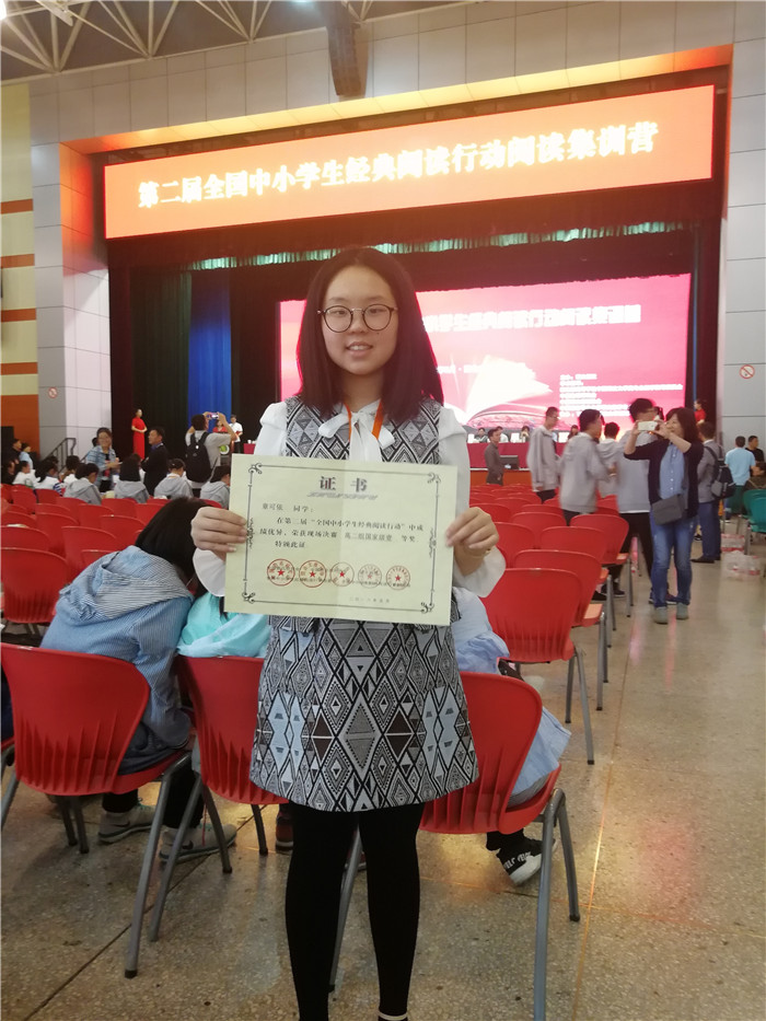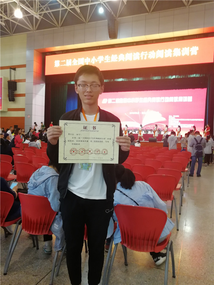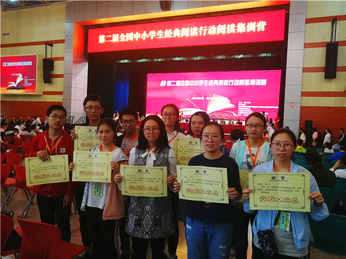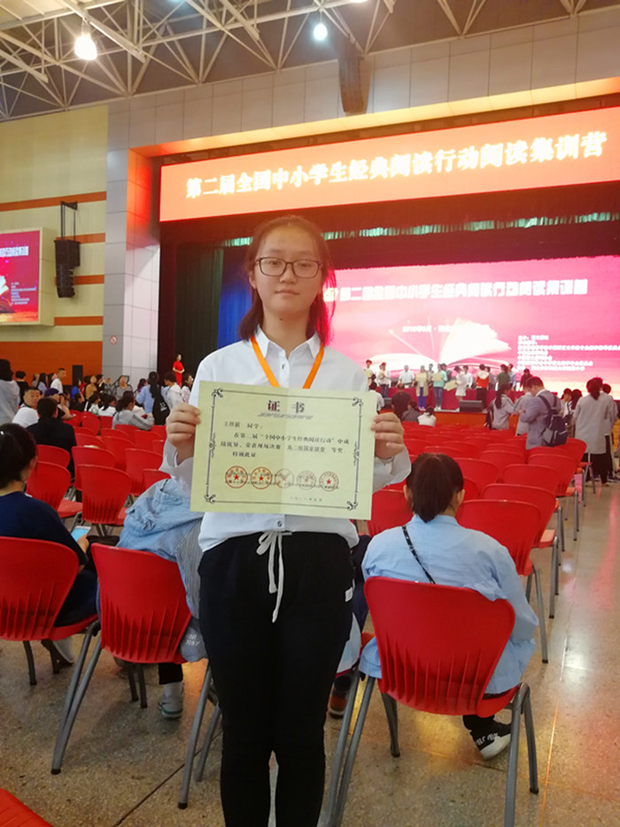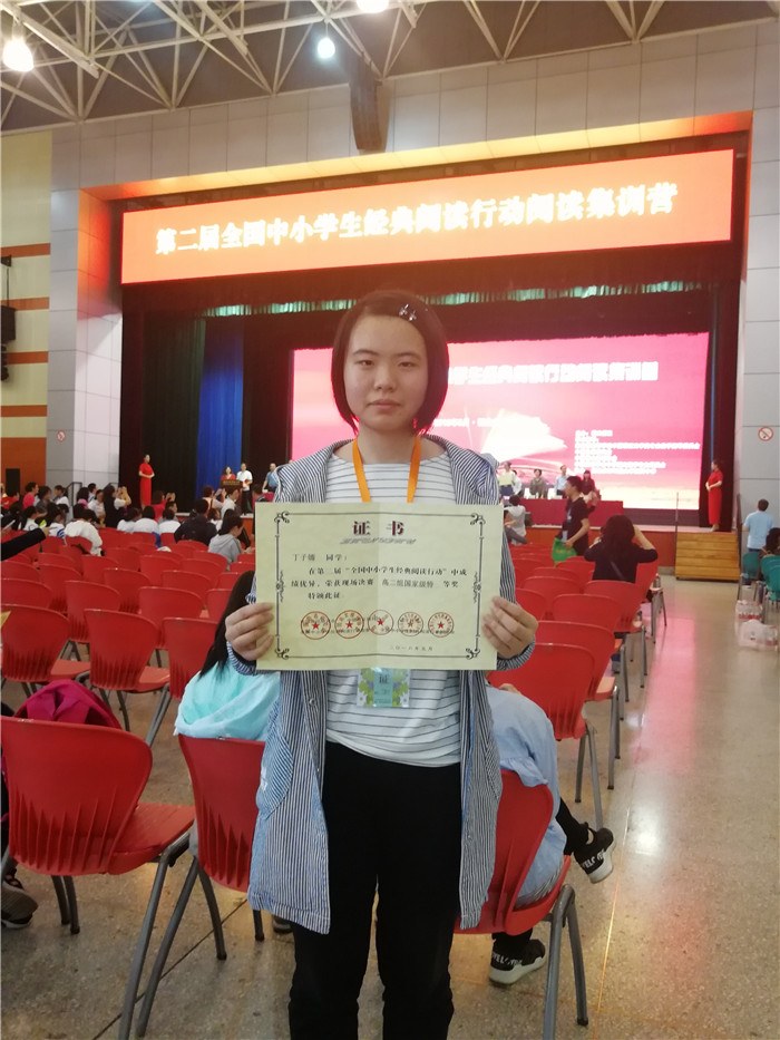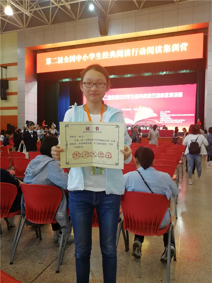 第二届“全国中小学生经典阅读行动”活动于2017年5月开始选拔,全国总计有60万中小学生参与了此项比赛,经过初选我校高二年级有10位同学脱颖而出,5月11—13日和来自全国各地的1320名同学一起参加了在陕西杨凌西北农林科技大学举行的第二届“全国中小学生经典阅读行动”现场决赛环节,经过激烈角逐,我校10名同学斩获殊荣。高二组国家级 特等奖 丁子嫣 高二11班