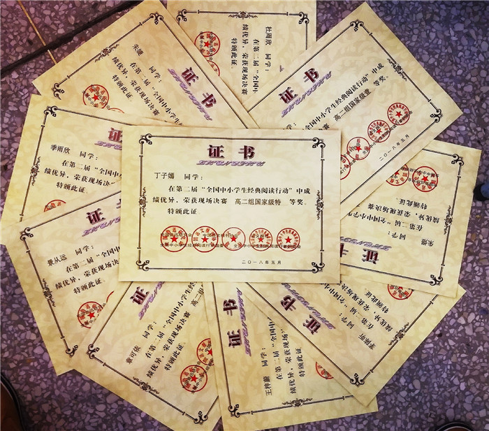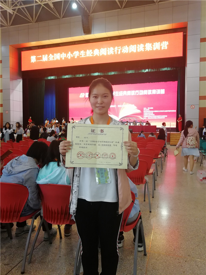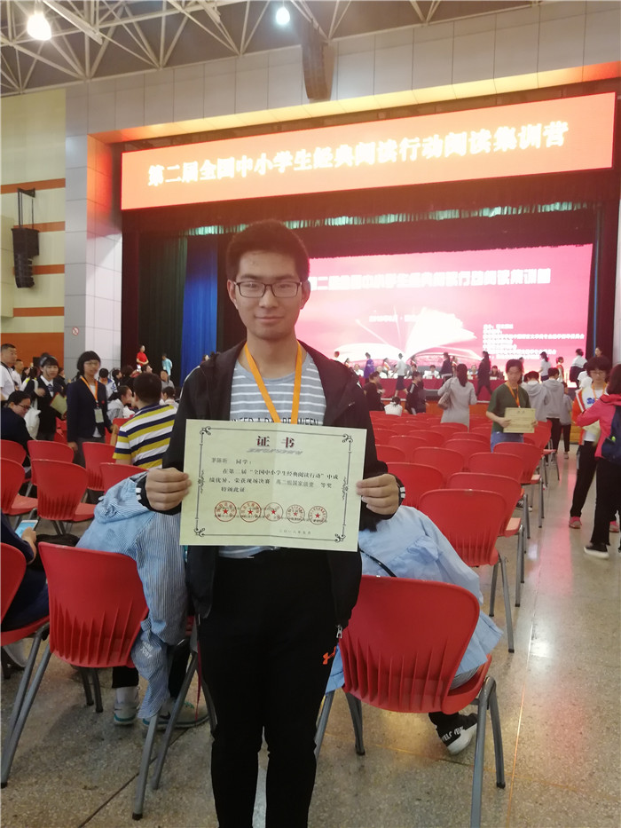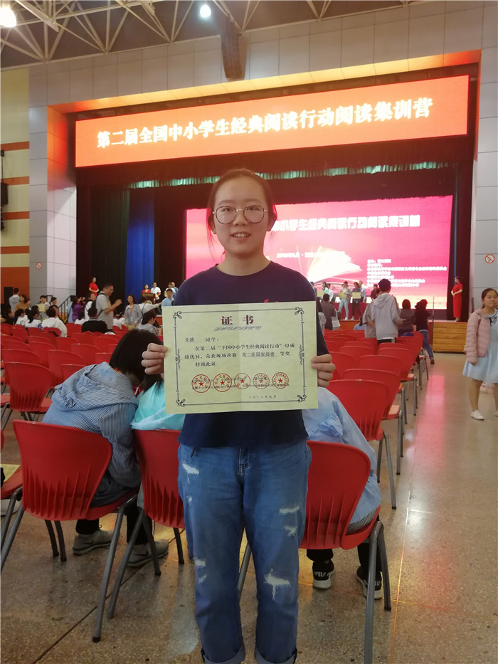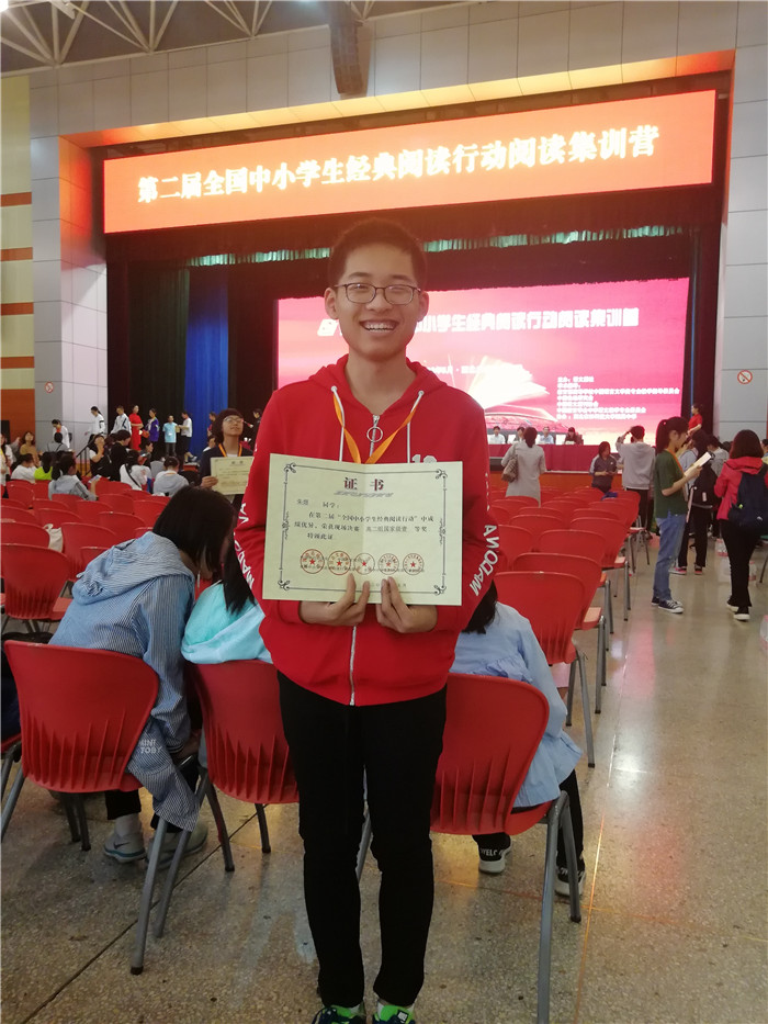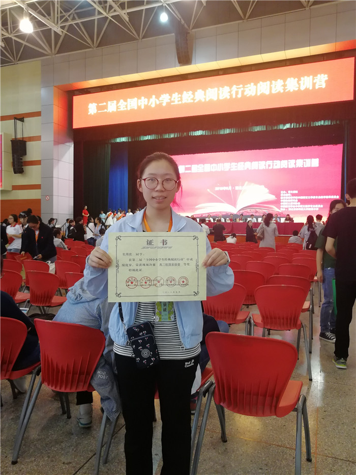 第二届“全国中小学生经典阅读行动”活动于2017年5月开始选拔,全国总计有60万中小学生参与了此项比赛,经过初选我校高二年级有10位同学脱颖而出,5月11—13日和来自全国各地的1320名同学一起参加了在陕西杨凌西北农林科技大学举行的第二届“全国中小学生经典阅读行动”现场决赛环节,经过激烈角逐,我校10名同学斩获殊荣。高二组国家级 特等奖 丁子嫣 高二11班