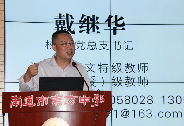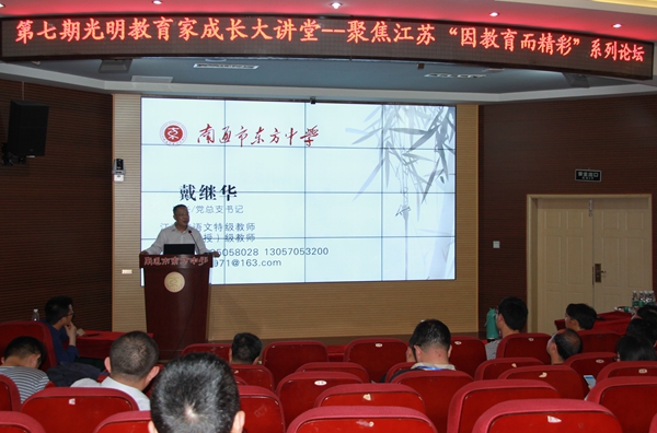 公开课结束后,由江苏省语文特级教师、正高级教师,南通市第一梯队名师培养对象,江苏省333工程培养对象。南通市东方中学党总支书记、校长戴继华与来宾一起分享了主题报告:《“分层走班教学”的思考与实践》,进一步从实践层面、理论层面研讨走班教学的“真境”课堂,为探寻适合学生的课堂提供了宝贵的理论支撑和实践经验。