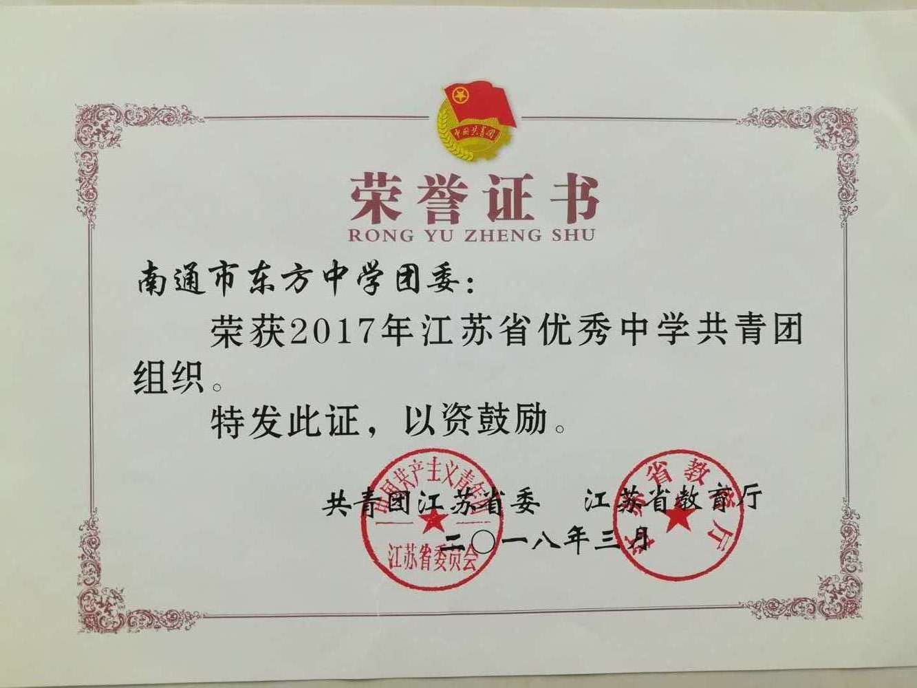 2018年五四青年节期间,从南通团市委传来喜讯,南通市东方中学团委荣获“2017年江苏省优秀中学共青团组织”荣誉称号。