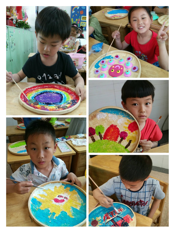 家长认真讲解之后,安排了活动任务,第一组和第四组的同学用水粉装饰簸箕,第二组的同学用剪纸拼贴装饰簸箕,第三组的同学用黏土装饰簸箕。丁诚的《彩虹球》、张卿源的《成王飞车》、王龚蕊的《太阳花》、唐浩宇的《笑脸》、范硕烁的《山坡上》都各具特色。同学们的倾心之作五彩缤纷、内容丰富、精彩纷呈。