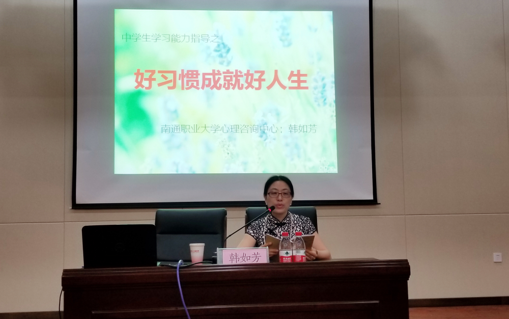 5月18日下午,应区未成年人保护中心和竹行中学的邀请,国家二级心理咨询师、学生学习能力指导师、注意力训练师、南通职大的韩如芳老师来我校开展讲座,指导初一学生如何养成良好的学习习惯。