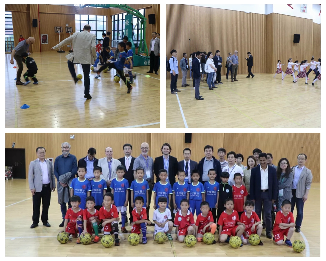 在朱军校长的陪同下,一行人观摩了武术操和足球队训练课。一进体育馆,足球训练的孩子们就吸引了外籍友人的目光,他们热情大方,主动邀请友人们参与训练,孩子们的球技得到了来自友人们的一致好评!我校自编的武术操气势磅礴,动作流畅,也给外国友人留下了深刻的印象。