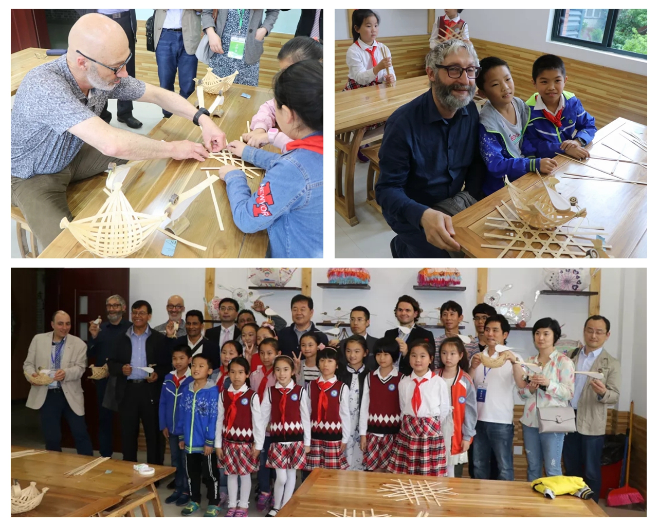 最后,在朱校长的带领下,友人们来到竹艺社团,社团的孩子们还邀请友人们一起编制竹工艺品,并将竹艺作品作为赠送给外籍友人。